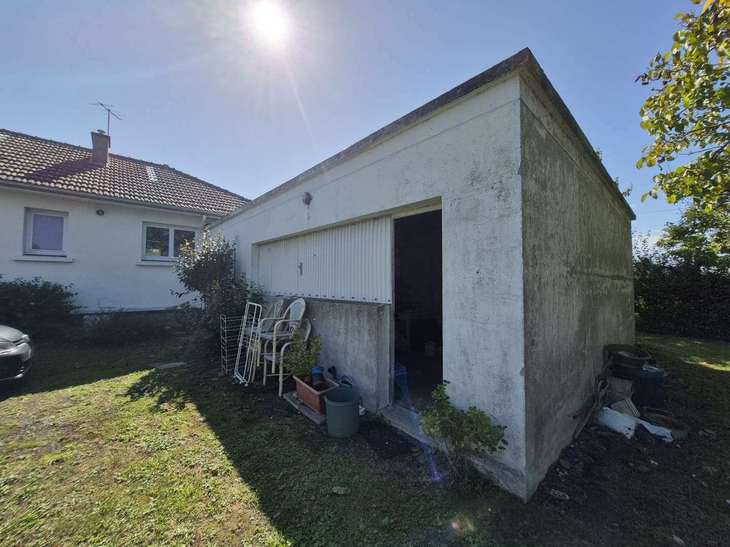 Construction 1955 en parpaings sur soubassement granit et couverture en tuiles. Batiment annexe en parpaings avec toit plat.