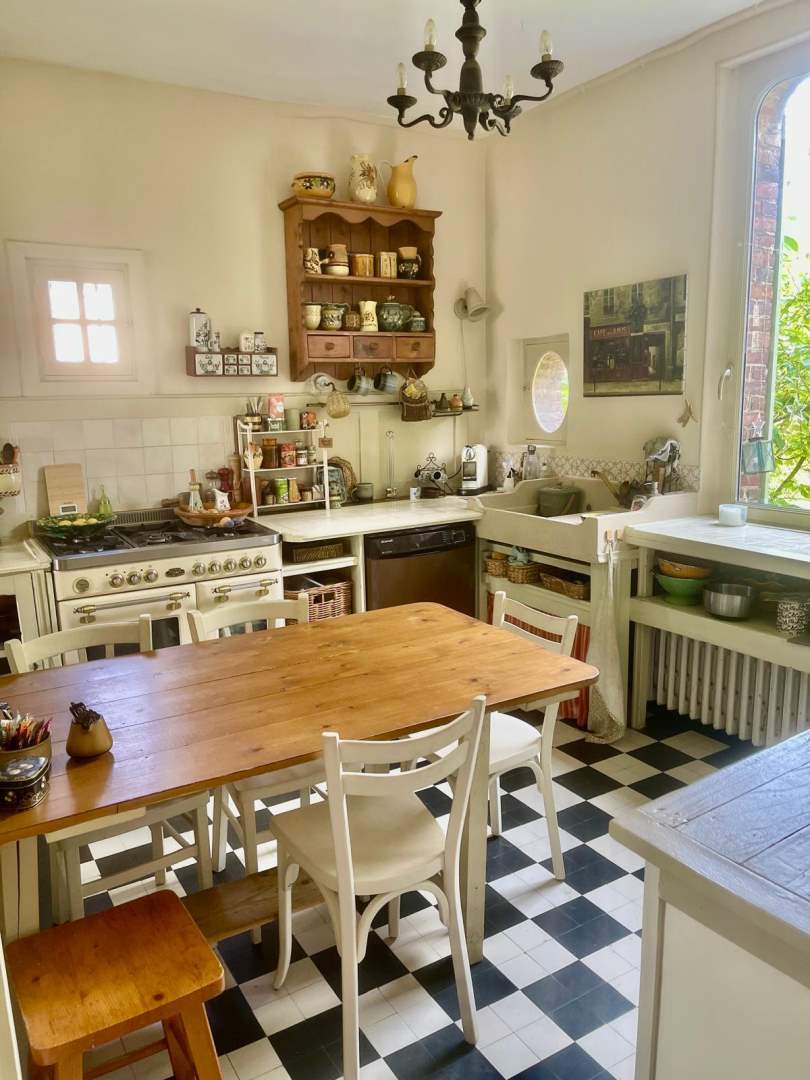 Elle se compose d'une entrée centrale, un séjour avec une cheminée fonctionnelle, une salle avec un poêle à bois, une cuisine dinatoire, un cabinet de toilettes, un bureau donnant sur le jardin. Au 1er étage un palier, qui dessert une salle de bain avec wc, une chambre principale avec sa salle de douche privative et petit balcon, 2 autres chambres. Au second étage un palier qui distribue une chambre avec point d'eau, 2 autres chambres, un grenier, une pièce aveugle.
