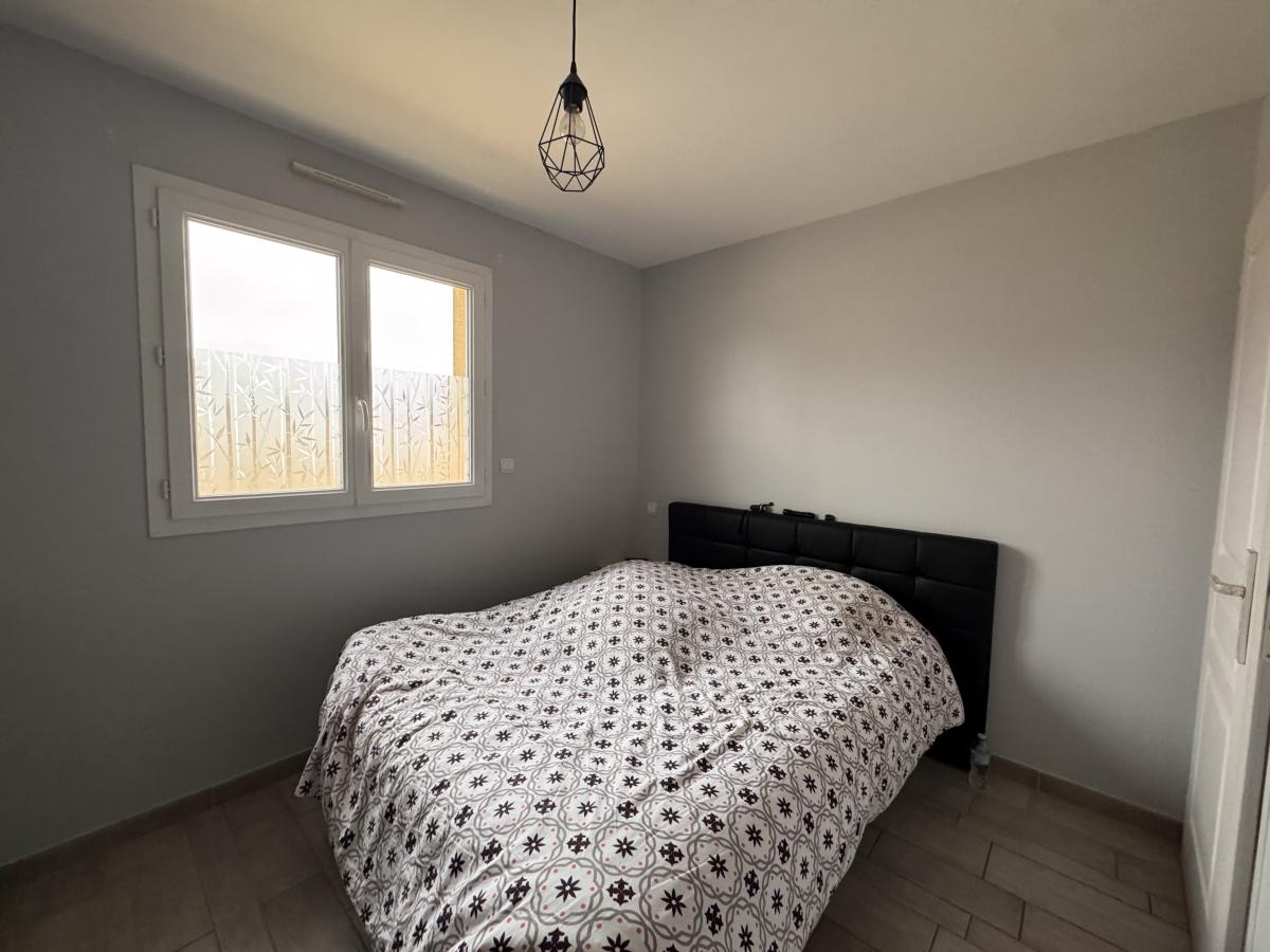 Elle se compose d'une entrée menant à une chambre avec une salle d'eau privative, wc séparé, puis d'une pièce de vie comprenant un salon-séjour avec poêle à granulés, ouvert sur une cuisine aménagée et équipée avec un accès direct à la terrasse, ainsi qu'un cellier.