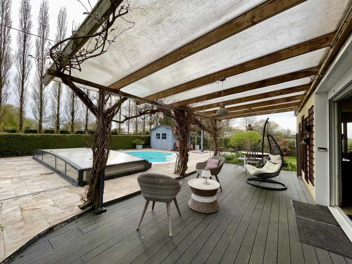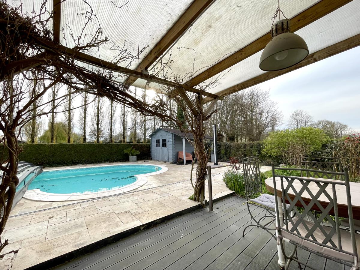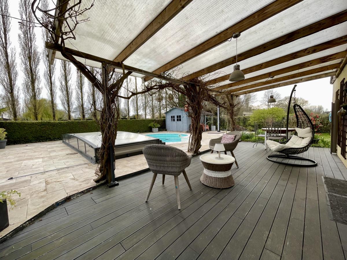 Maison d'habitation de 1986 comprenant : Au rez-de-chaussée une entrée desservant un séjour avec poêle à granulés , cuisine aménagée et équipée ouverte , une chambre avec salle d'eau , wc , véranda et garage . A l'étage deux chambres , une salle de bains et dressing Pour compléter cette maison une grande terrasse avec un accès direct sur la piscine . Abri de jardin . Terrain clos de 2000 m²