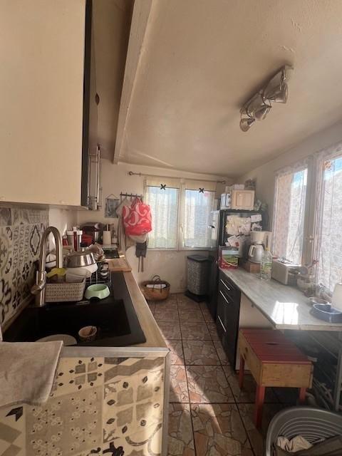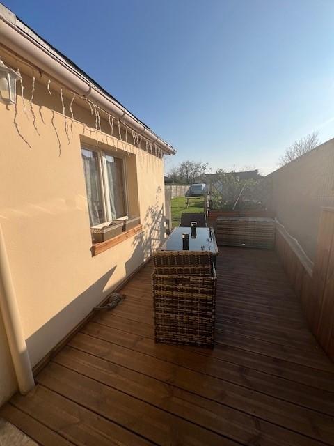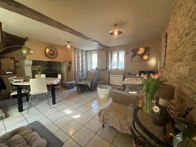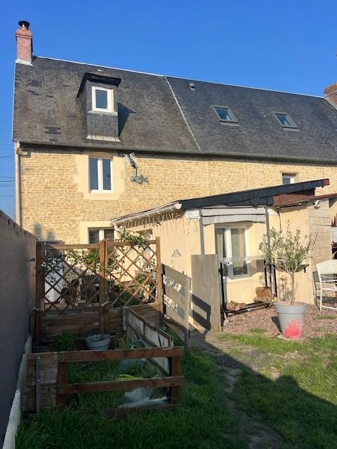 MEZIDON CANON, maison de ville construite en pierre mitoyenne d'un coté comprenant au RDC : cuisine, séjour-salon avec poêle à bois, salle d'eau et wc. Au 1er étage : bureau, une chambre. Au 2ème étage : petite chambre, salle de bains. Garage au fond du jardin. Jardin agréable de 502 m².