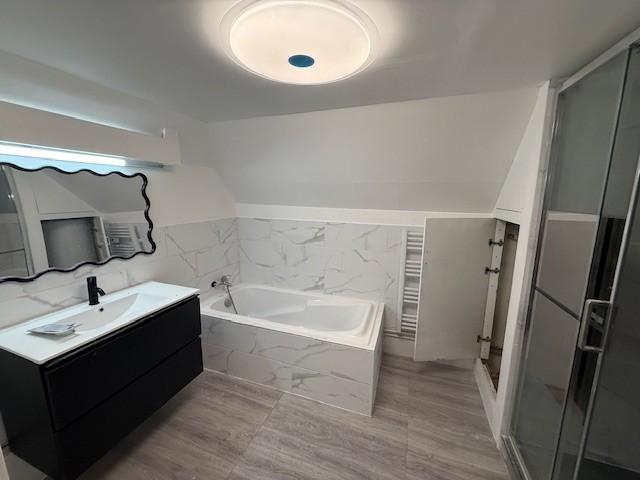 - Au rez-de-chaussée : un séjour cheminée, cuisine, chambre, salle de bains avec WC et bureau.