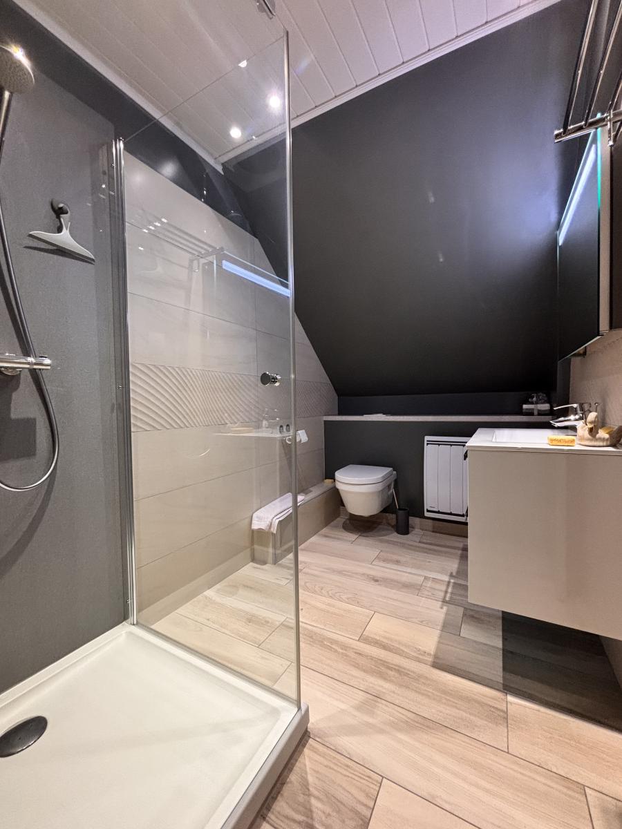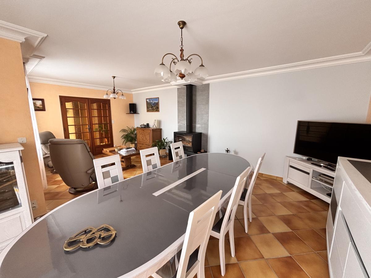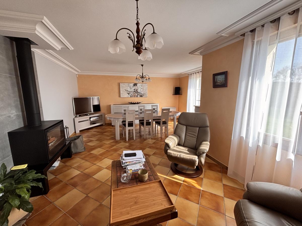 Au Rdc: Entrée, cuisine indépendante A/E, pièce à vivre avec poêle à bois, deux chambres, salle de bains + douche et wc