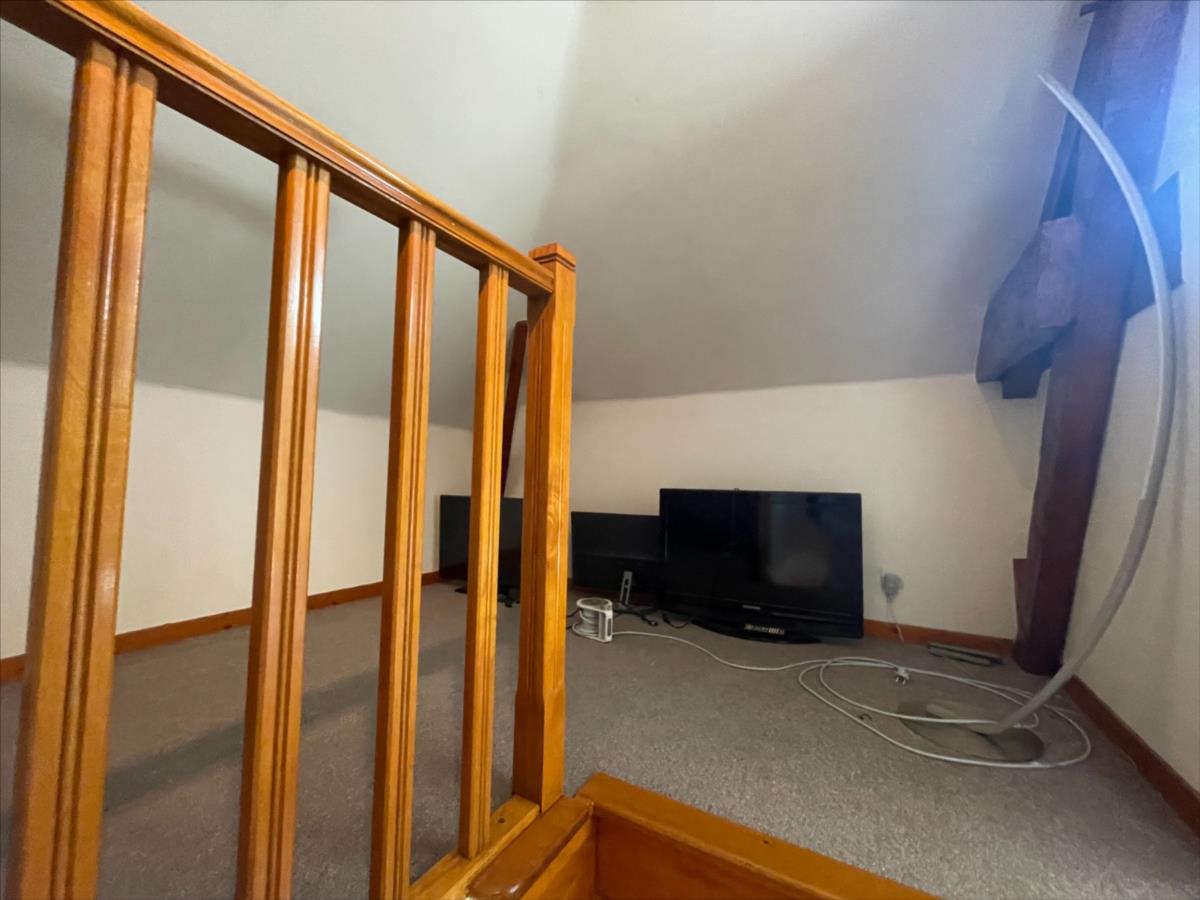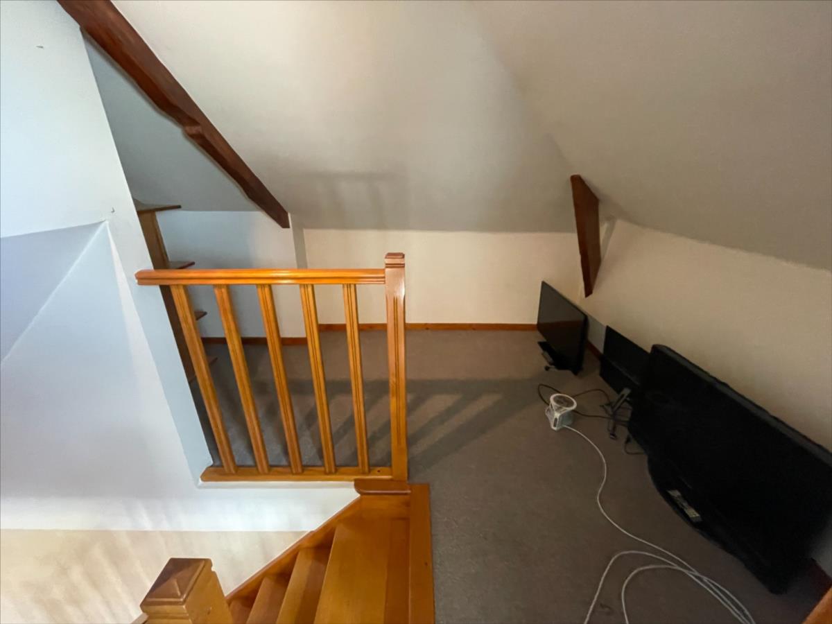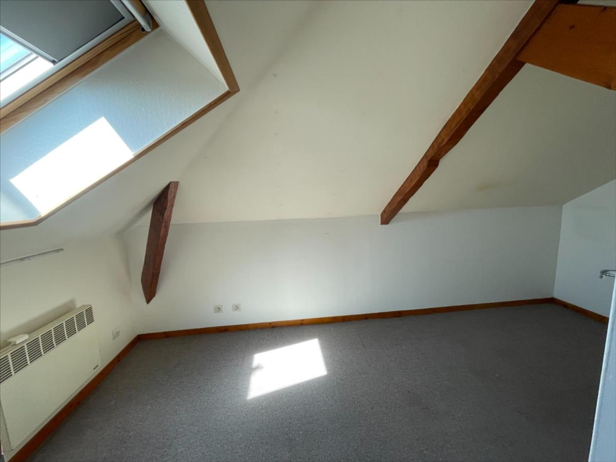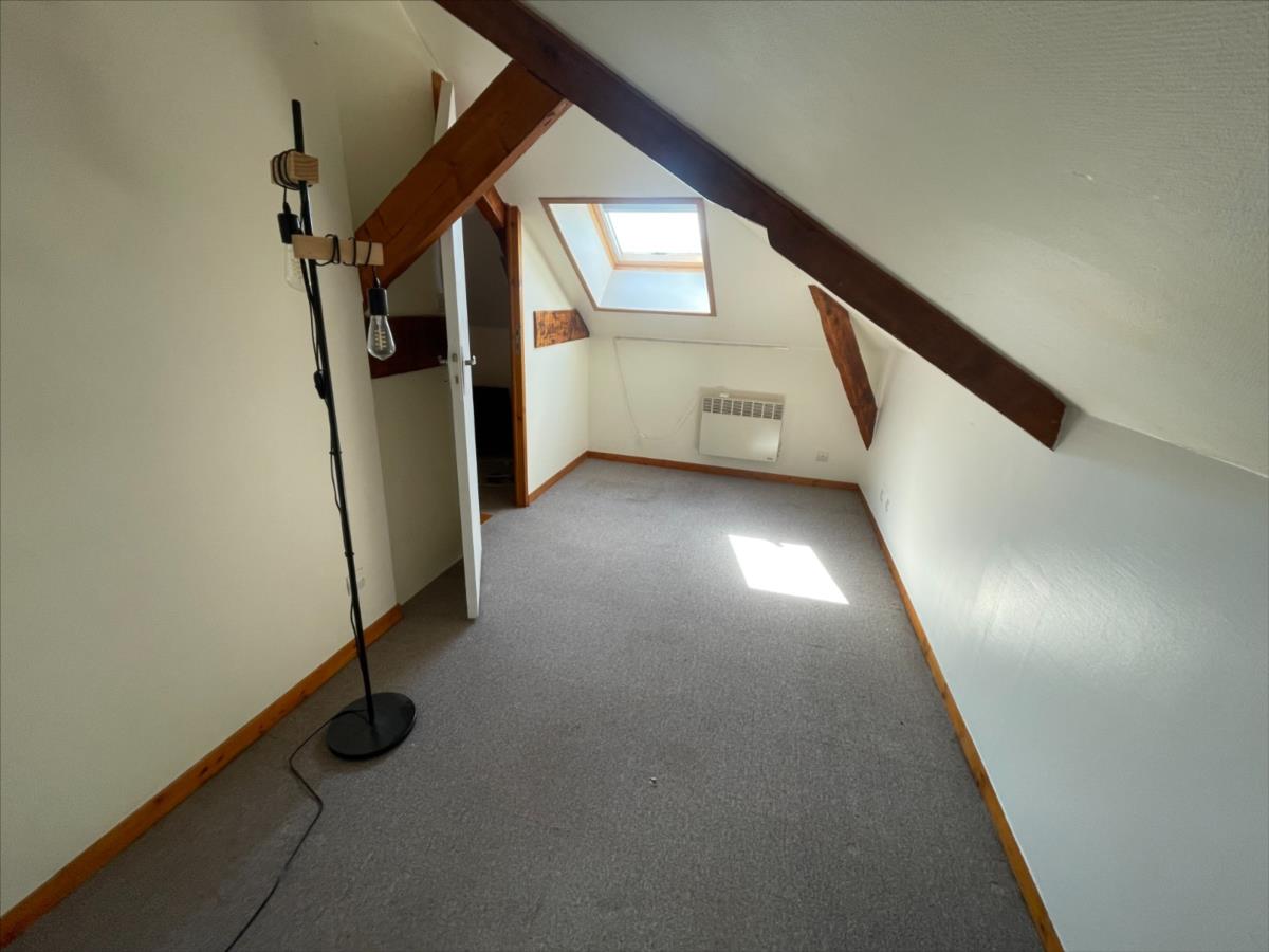 salon, cuisine aménagée, terrasse dallée. Au 1er palier, chambre 3 mansardée.