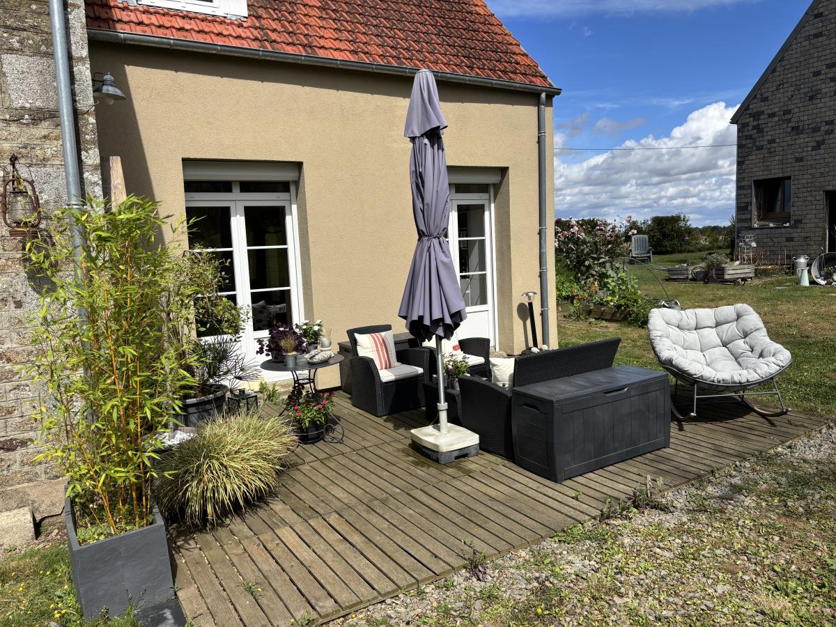 La maison principale, bien entretenue, se compose au rez-de-chaussée d’une cuisine ouverte sur la salle à manger, donnant accès à une terrasse, d’un salon équipé d’un poêle à bois et d’une salle de bains.