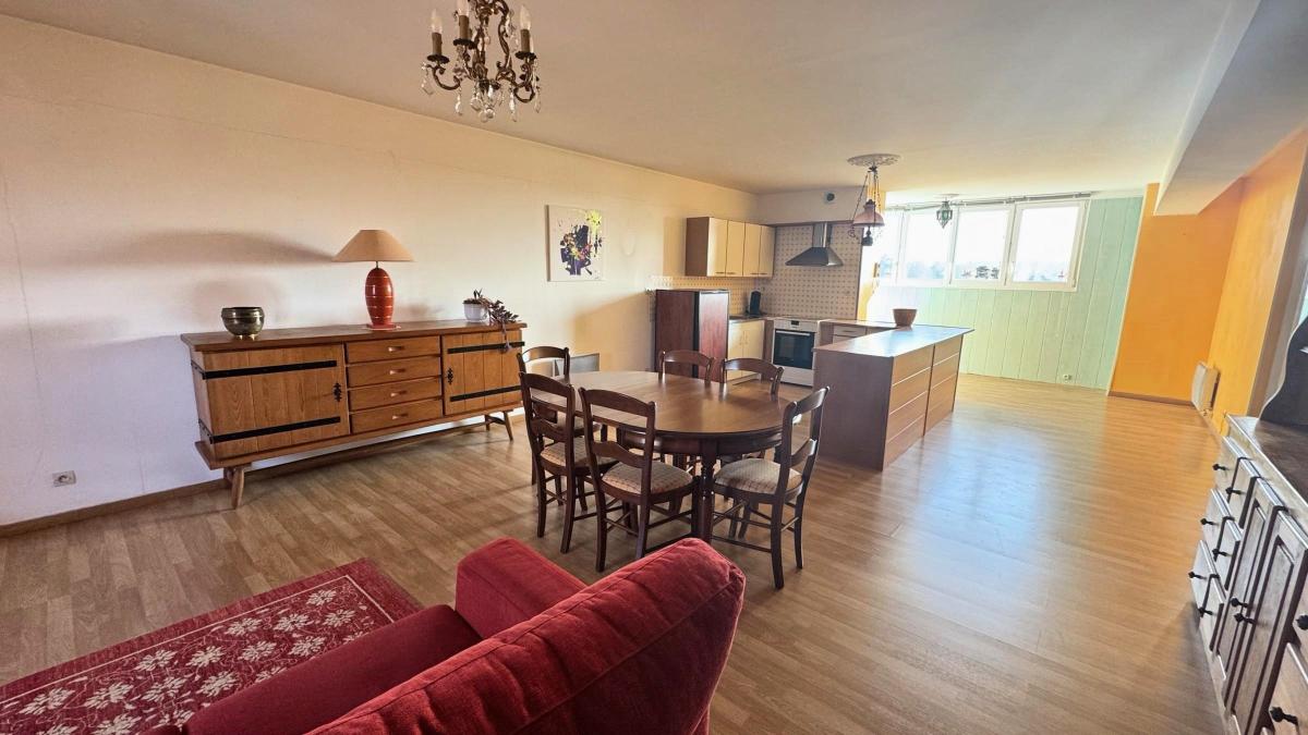 Entrée avec placard, Une cuisine aménagée ouverte sur un spacieux séjour/salon traversant de 52 m², dégagement, deux chambres (x2 de 14m²) dont une avec placard, salle de douche, WC.