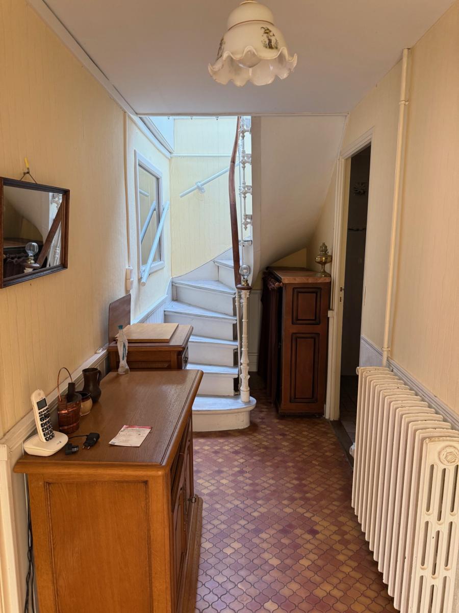Percy-En-Normandie, Maison de bourg comprenant : Au rez-de-chaussée : entrée, séjour, cuisine, salle d'eau avec WC, buanderie, une chambre. A l'étage : un palier desservant deux chambres dont une WC et lavabo. Cellier/cave attenant. Stationnement devant la maison. Courette sur le côté.