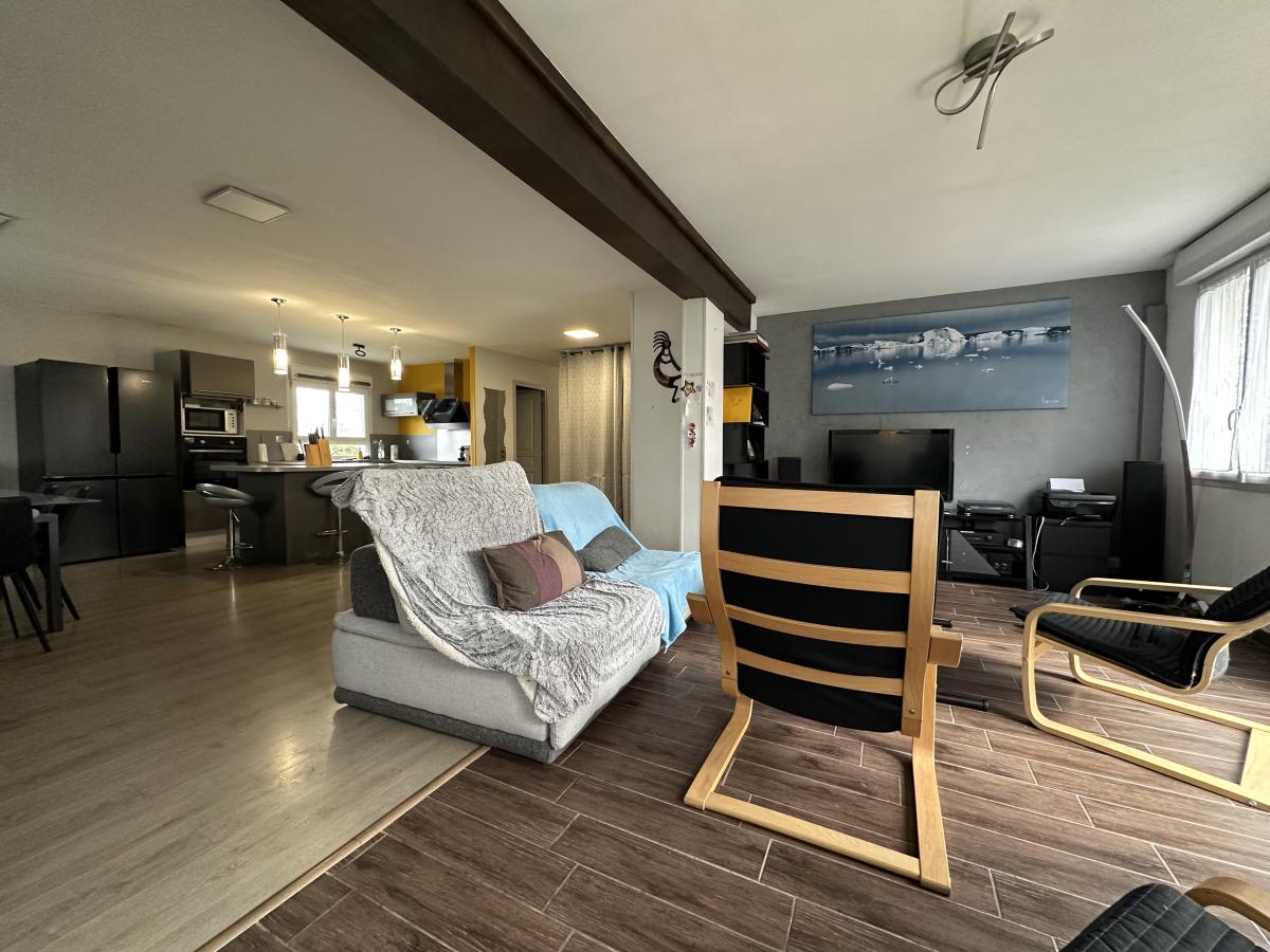 - Au rez-de-chaussée : entrée, cuisine aménagée et équipée (meubles hauts et bas, hotte aspirante, plaque électrique, lave-vaisselle et four), salle-salon avec poêle à bois, trois chambres, salle d’eau,