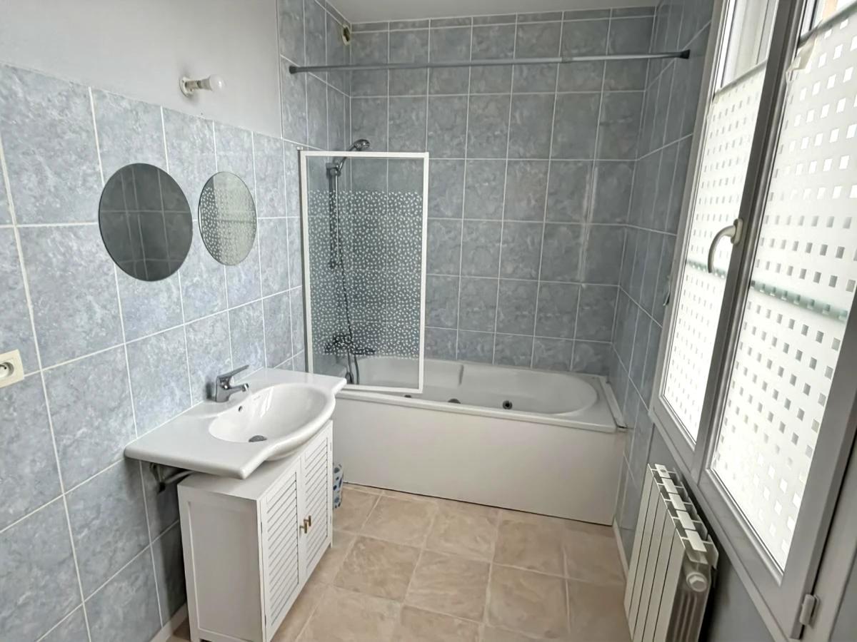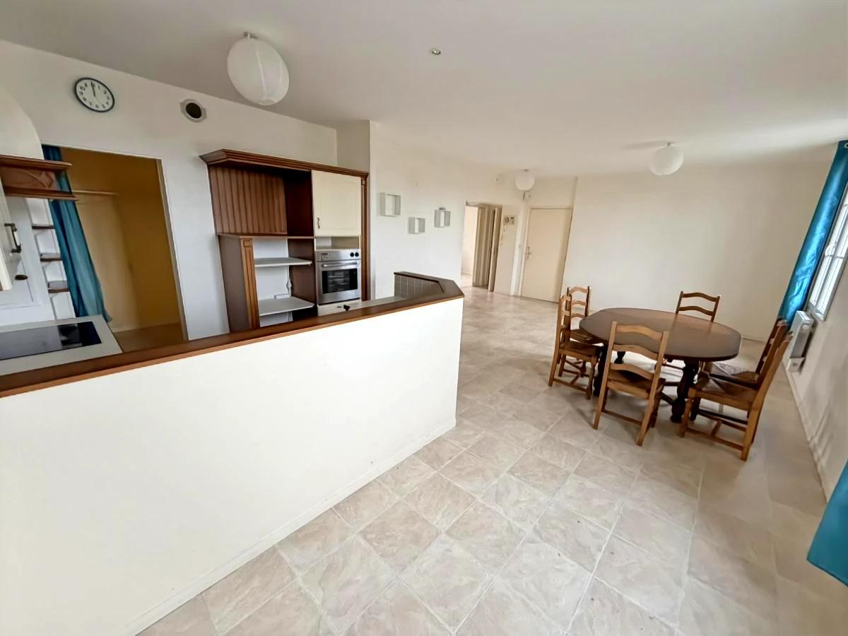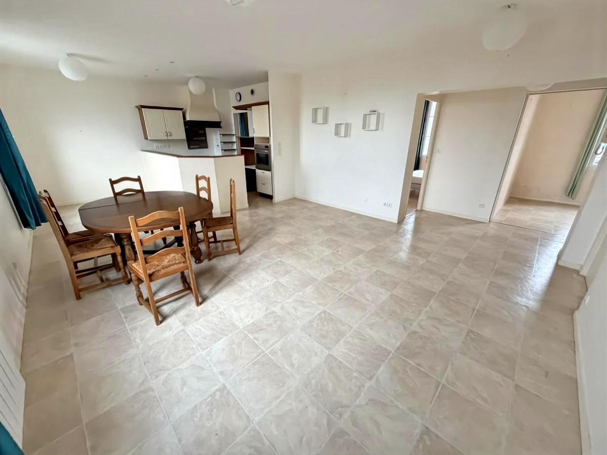 Barneville, en centre bourg, appartement en rez de chaussée comprenant : grand séjour avec cuisine ouverte équipée, arrière-cuisine/buanderie avec placard, deux chambres dont une avec placard, salle de bains, WC avec lave-mains.
