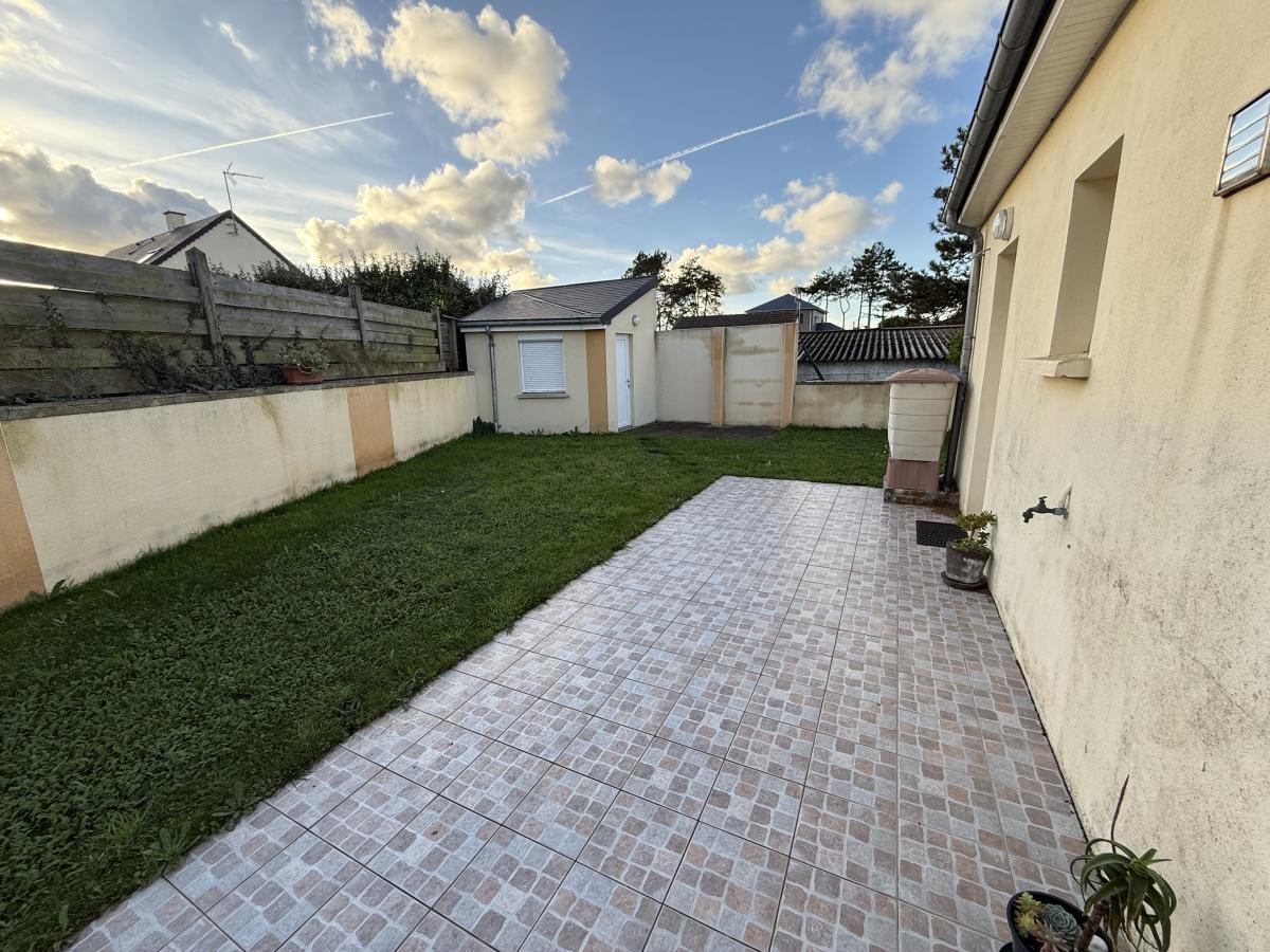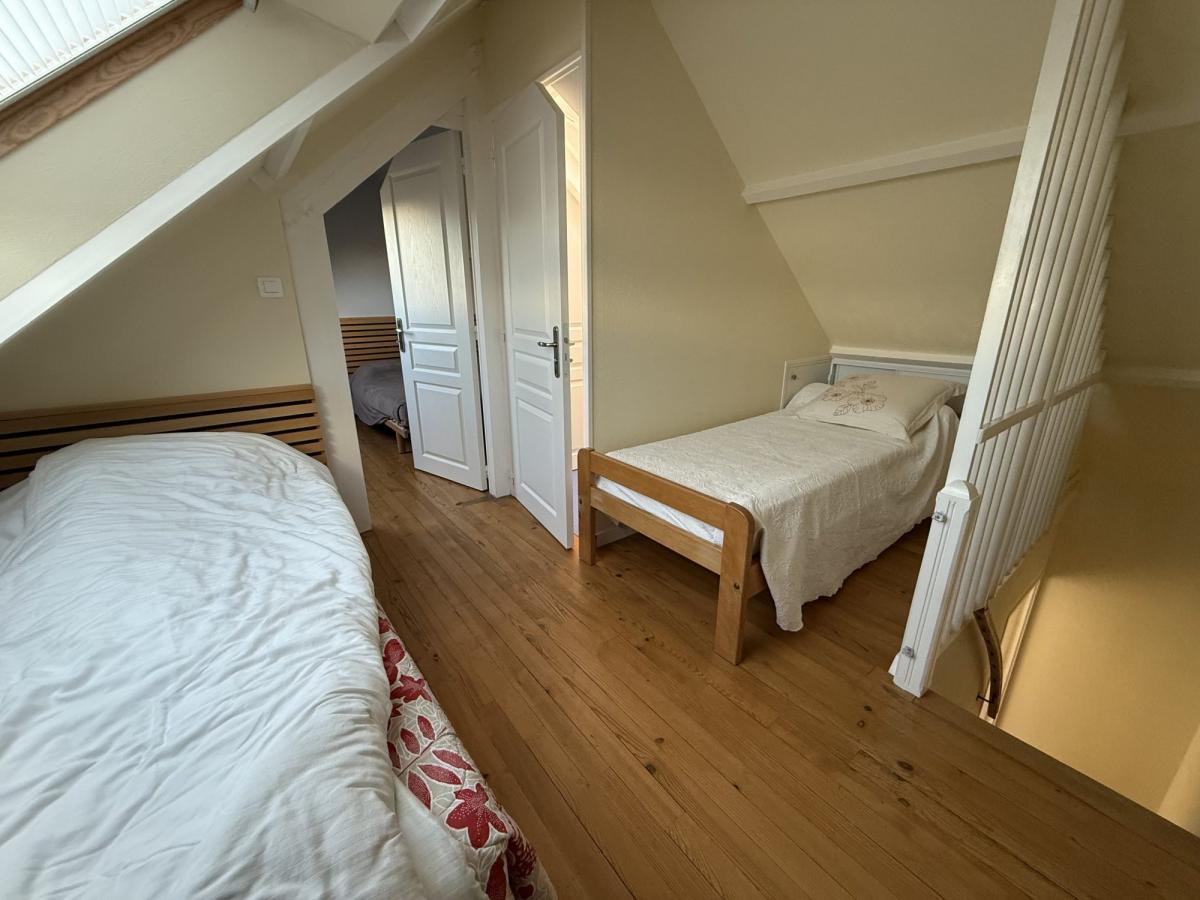 - A l'étage: pièce palière (chambre d'appoint), une chambre avec placards, WC avec lave-mains. Jardin autour avec cellier et terrasse carrelée.