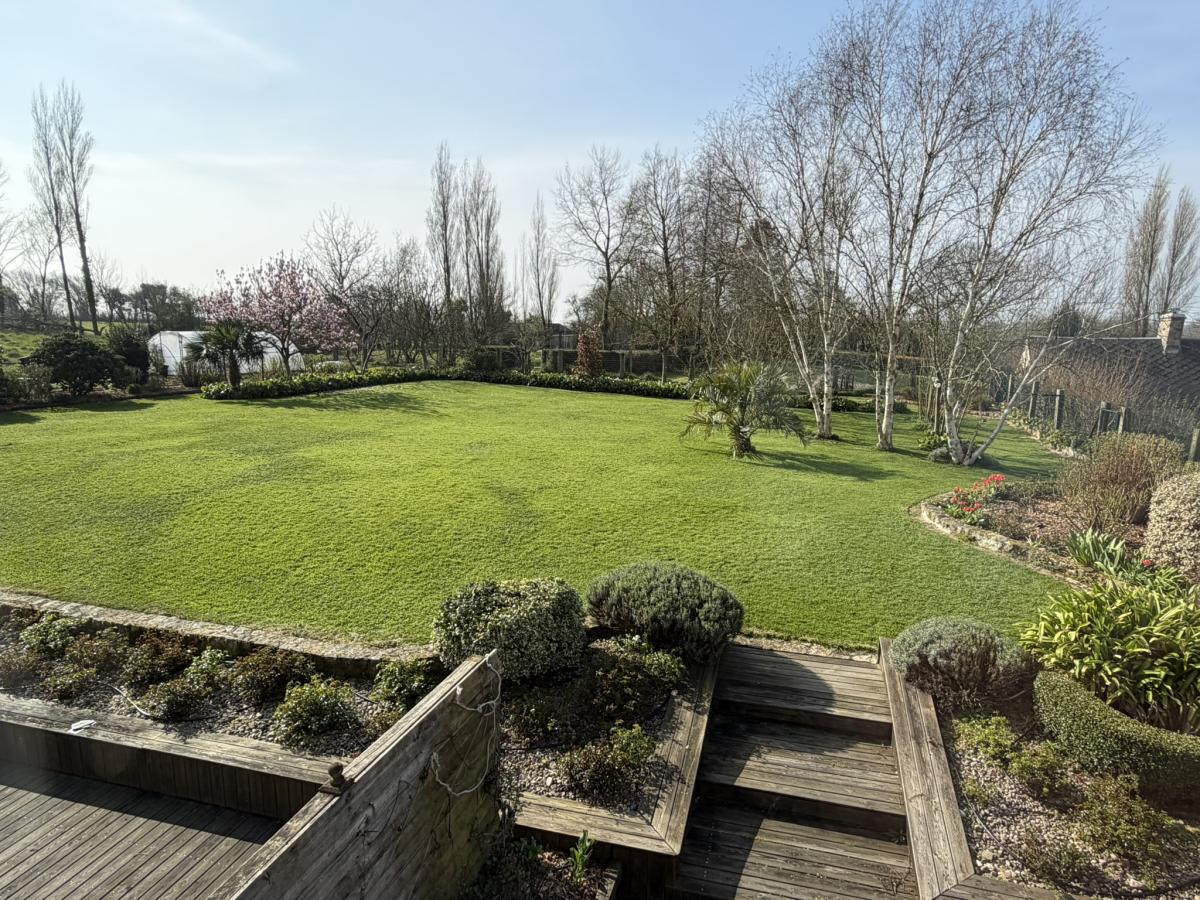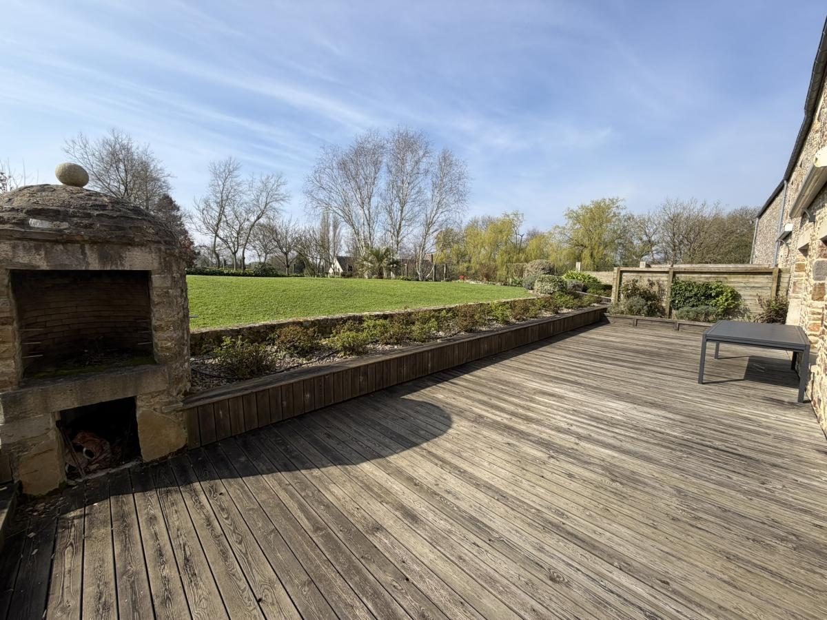 Jardin planté sur l’arrière du bâtiment principal avec grande terrasse en bois et stores. Présence d’un robot tondeuse, d’un système d’arrosage, de panneaux solaires et de deux bornes de recharge pour véhicules électriques.