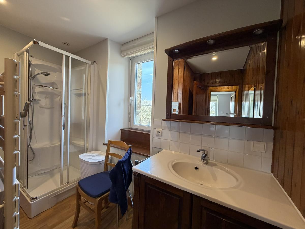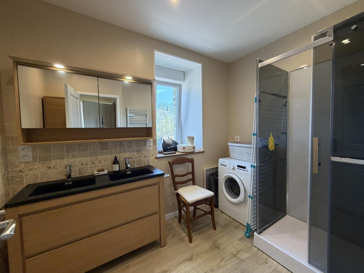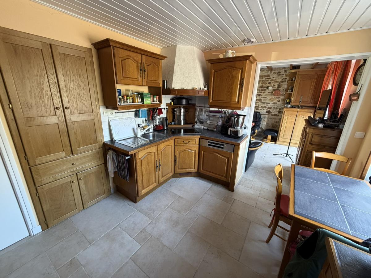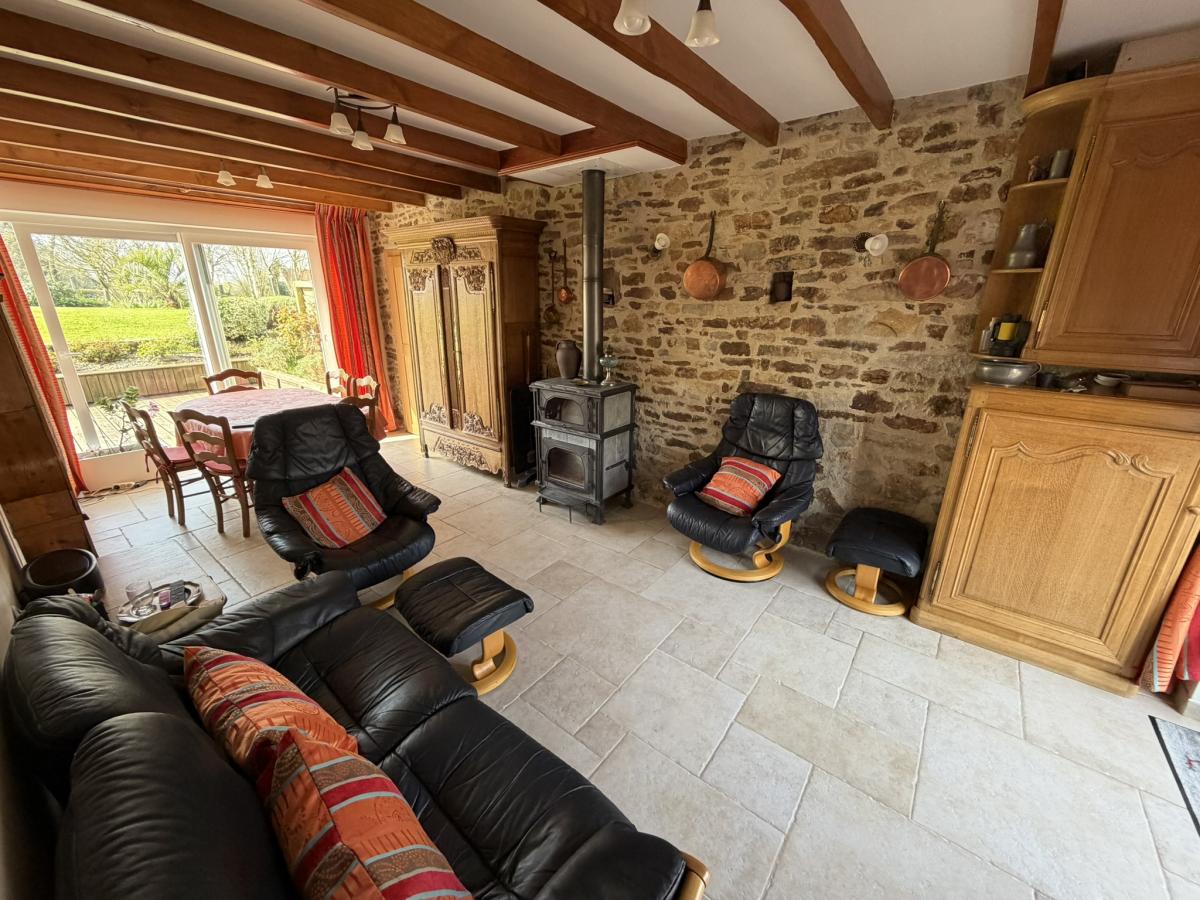 2°) Un second logement attenant comprenant un séjour avec cheminée + poêle à granulés et cuisine ouverte équipée, coin-buanderie avec lavabo, WC. A l’étage : palier, trois chambres dont deux avec placards, salle d’eau avec WC et placard. Au deuxième étage : grenier aménageable.