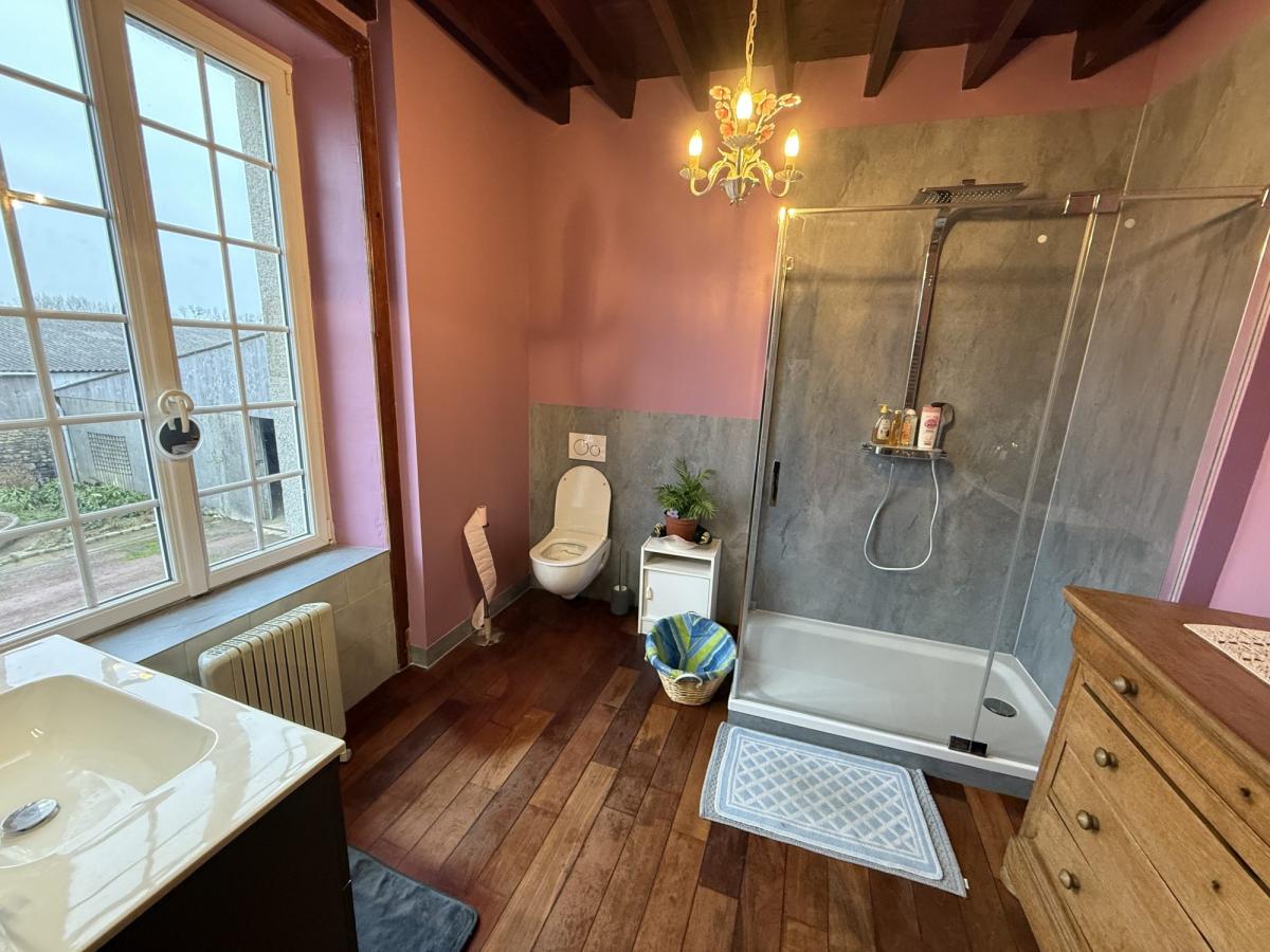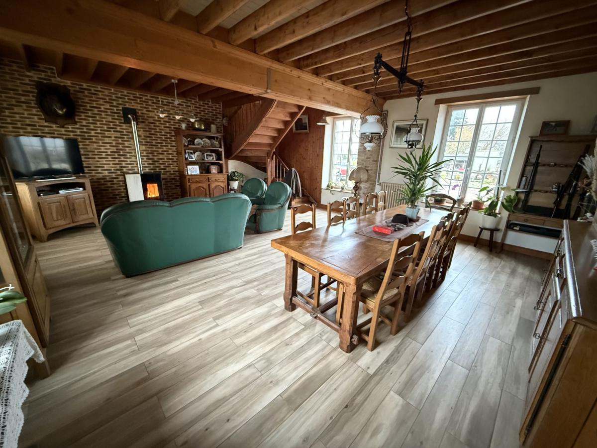 Une maison d'habitation composée de: grand séjour avec poêle à granulés, cuisine aménagée avec cheminée et four à pain, arrière-cuisine, bureau, WC. Au premier étage: deux chambres, salle d'eau avec WC. Au deuxième étage: deux chambres.
