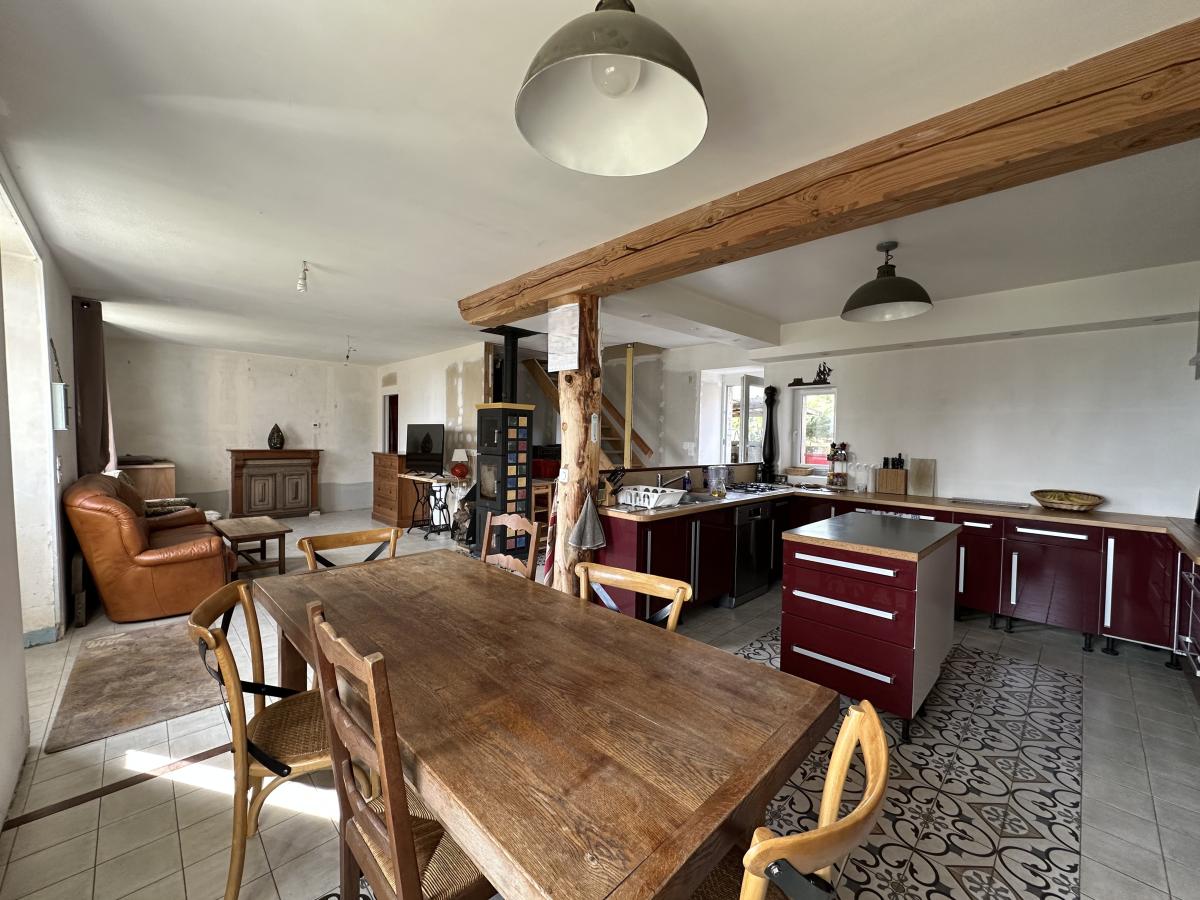 La maison principale vous offre au rez-de-chaussée : Une belle pièce à vivre de 55m² avec poêle à bois (chauffage électrique au sol), un wc indépendant, (salle d'eau possible dans le dégagements attentes d'eau).