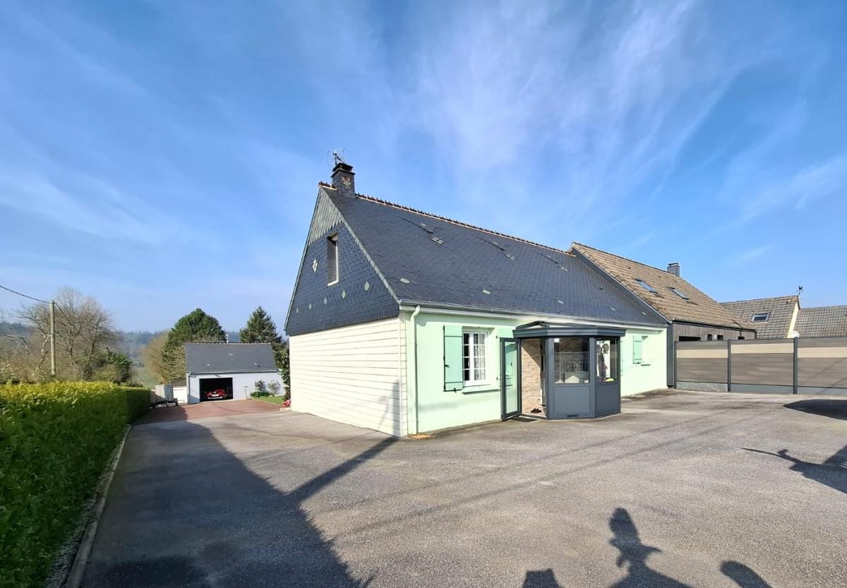 Située à SAUSSEMESNIL, au calme maison avec autonomie de plain-pied comprenant : RDC : entrée, séjour salon avec poêle à bois, cuisine aménagée et équipée, dégagement, salle d'eau, WC, 2 chambres (dont une aménagée en buanderie avec placards). ETAGE : dégagement, 2 chambres mansardées et un coin bureau / rangement. Terrasse exposée ouest ! Cour goudronnée et garage indépendant dans le fond.
