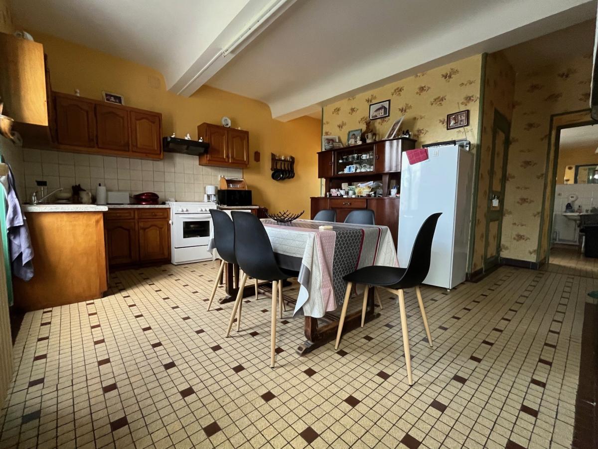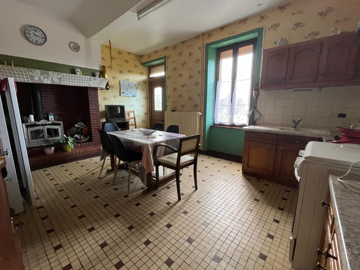 Cuisine avec cheminée (poêle à bois) 20 m², salon 20 m², salle de douches, wc, buanderie,