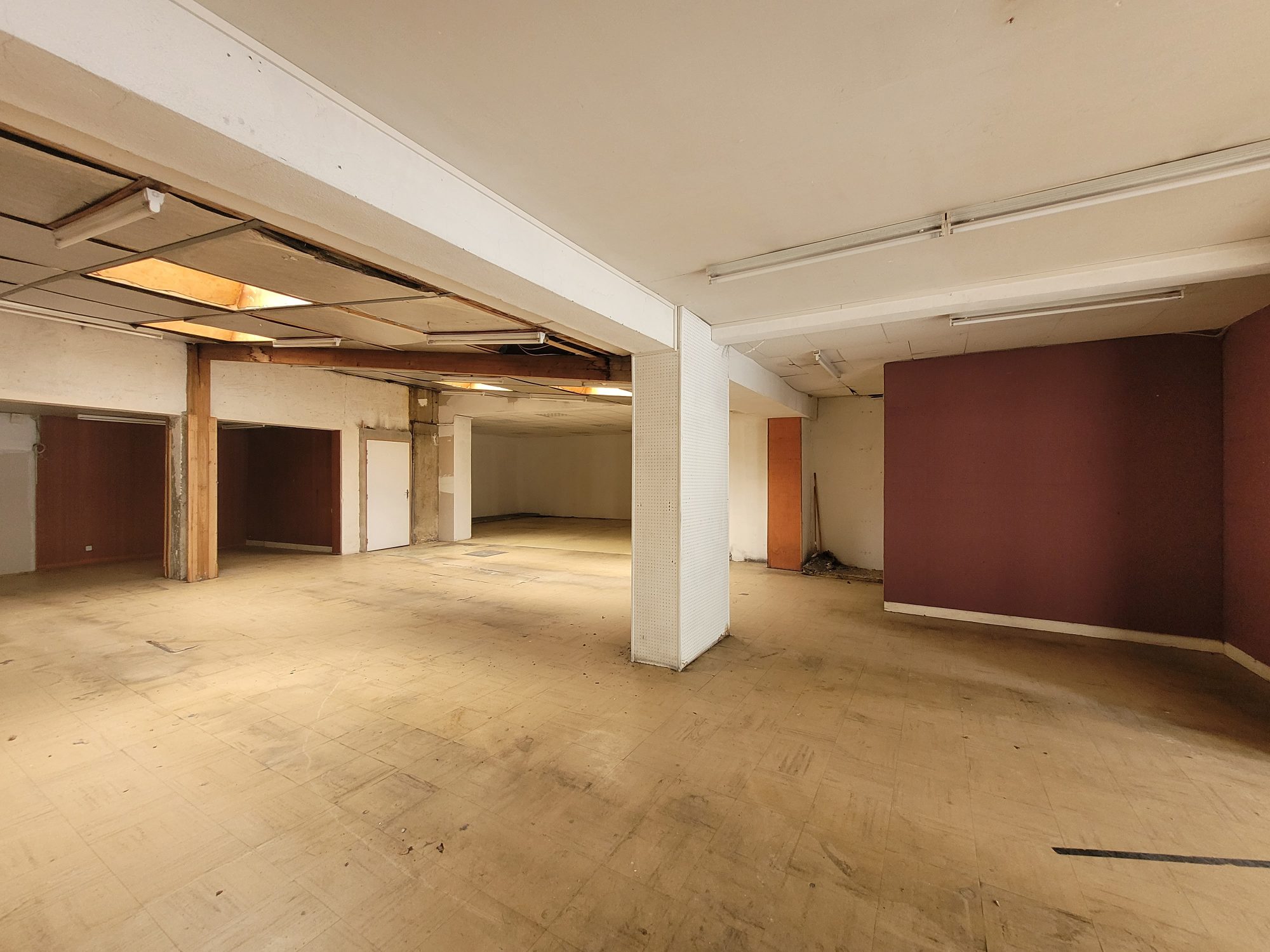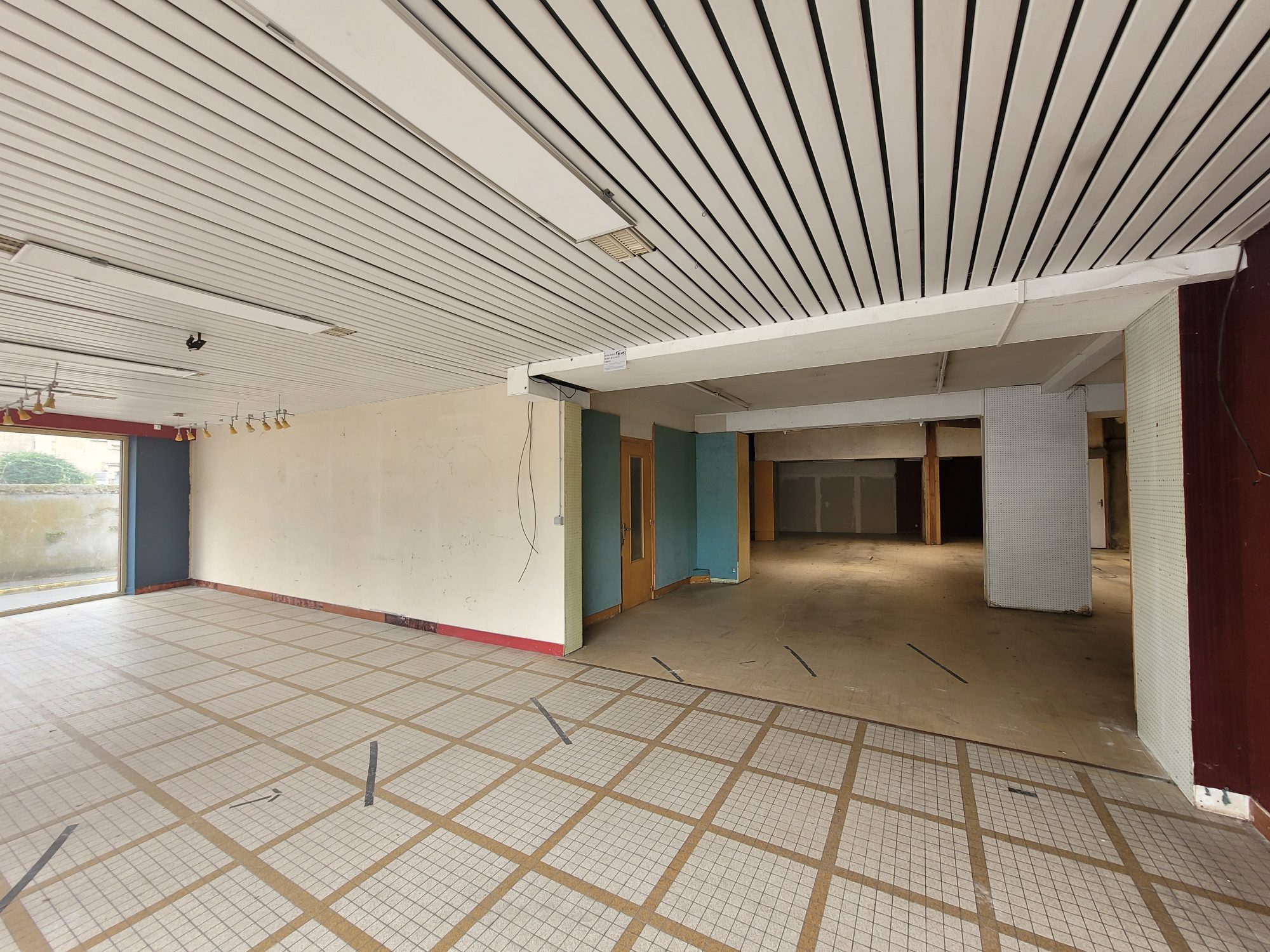 Au rez-de-chaussée : local commercial avec sanitaire (ancienne quincaillerie), bureau, remise, garage, courette, chaufferie et greniers à l’étage.