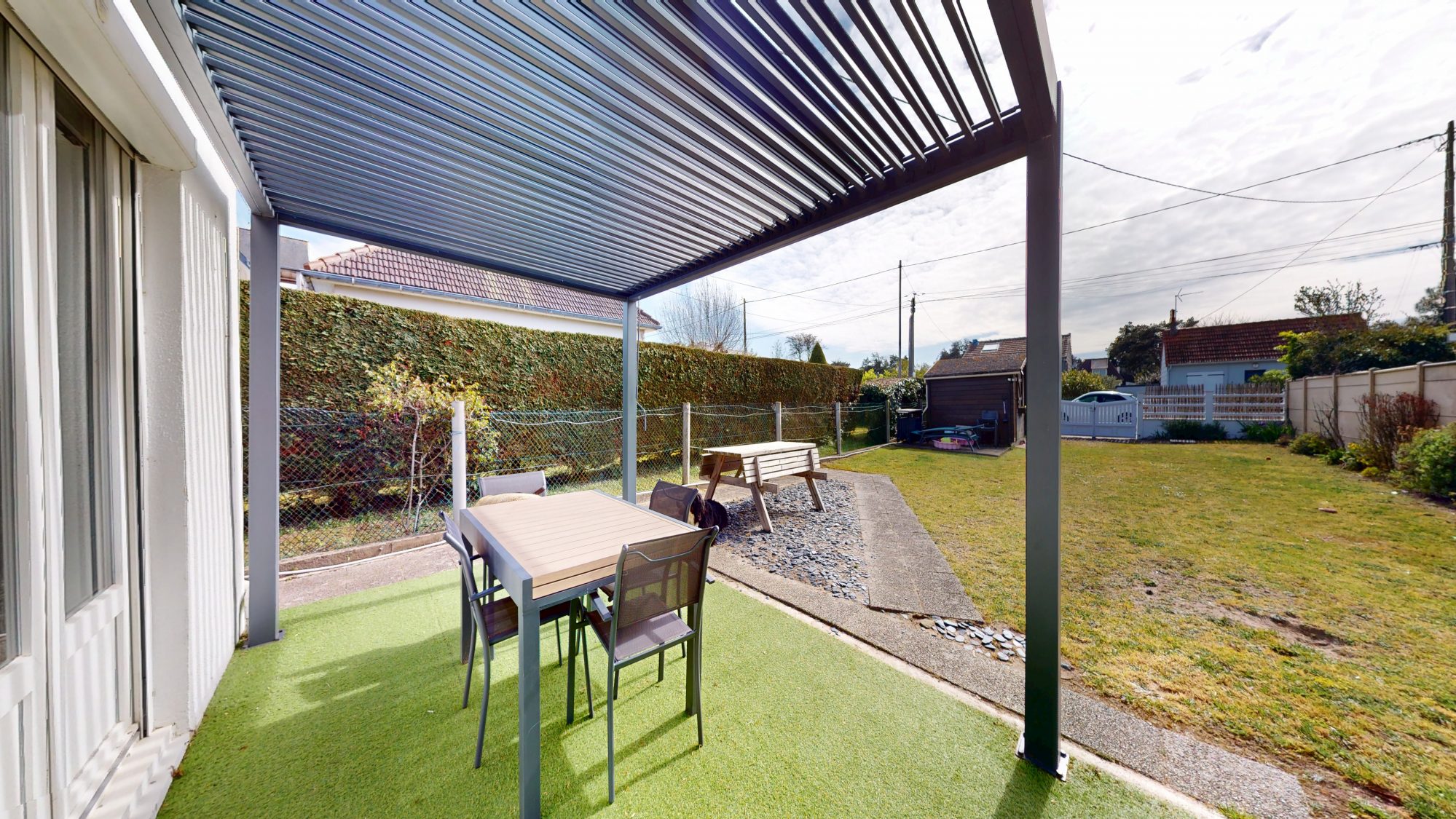Terrasse avec pergola, cabanon de jardin et jardin autour.