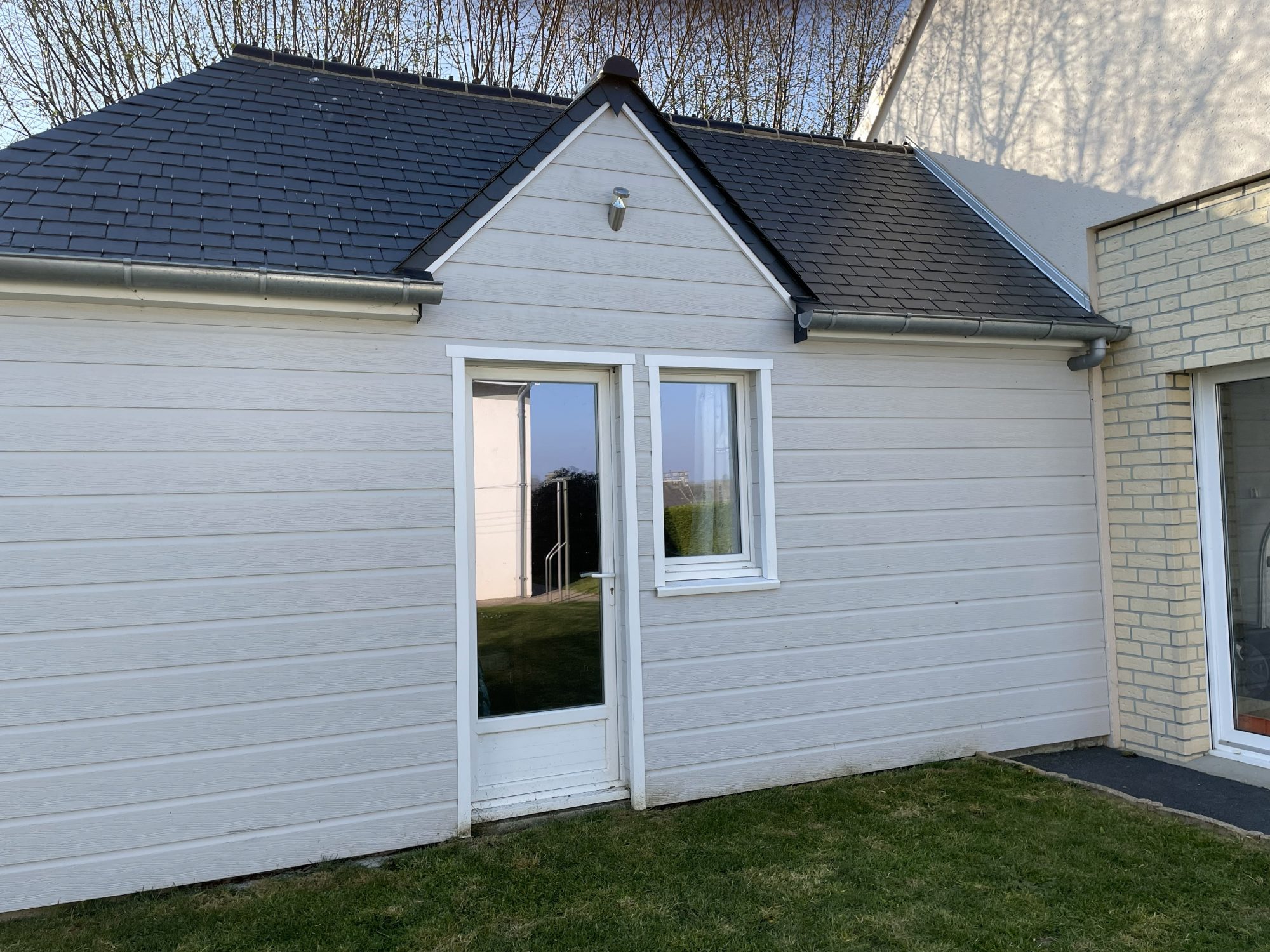 Un terrain sur lequel un studio aménagée en chambre et un cabanon de jardin.