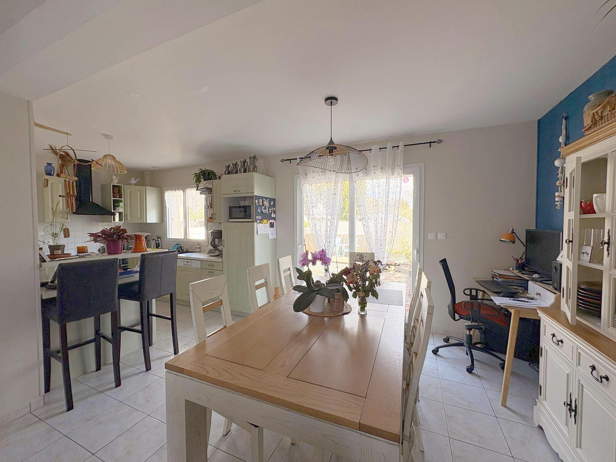Au rez-de-chaussée : une entrée desservant l'escalier de l'étage, WC, un salon-séjour avec poêle à granulés ouvert sur une cuisine aménagée et équipée.