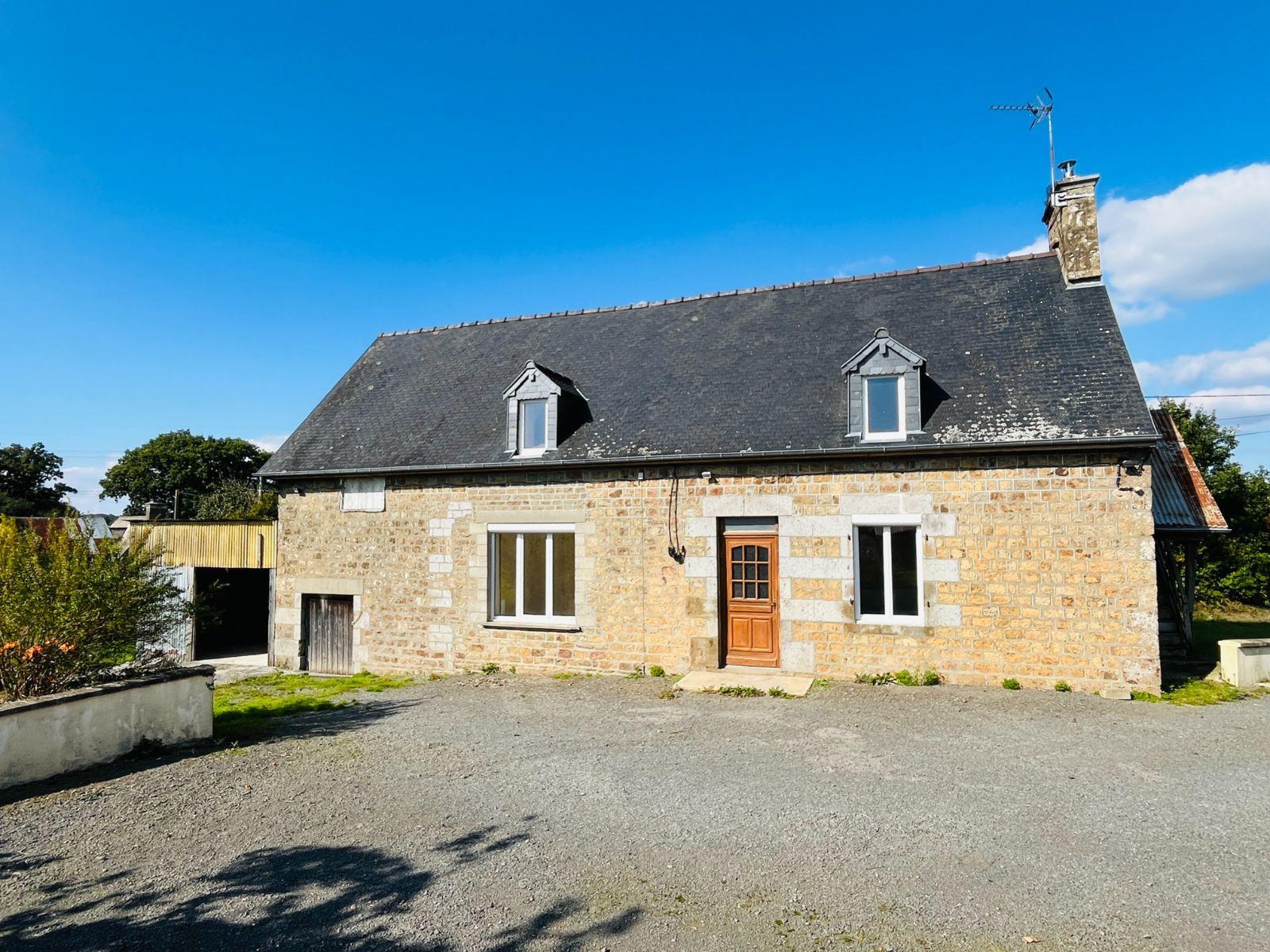 A vendre sur la commune de Le Mesnil-Rainfray, à 5 minutes de Juvigny-les-Vallées et à 15 minutes de Saint-Hilaire-du-Harcouët, en campagne dans un environnement calme au fond d'une impasse, maison en pierres sous ardoises de 71 m² habitables, comprenant :