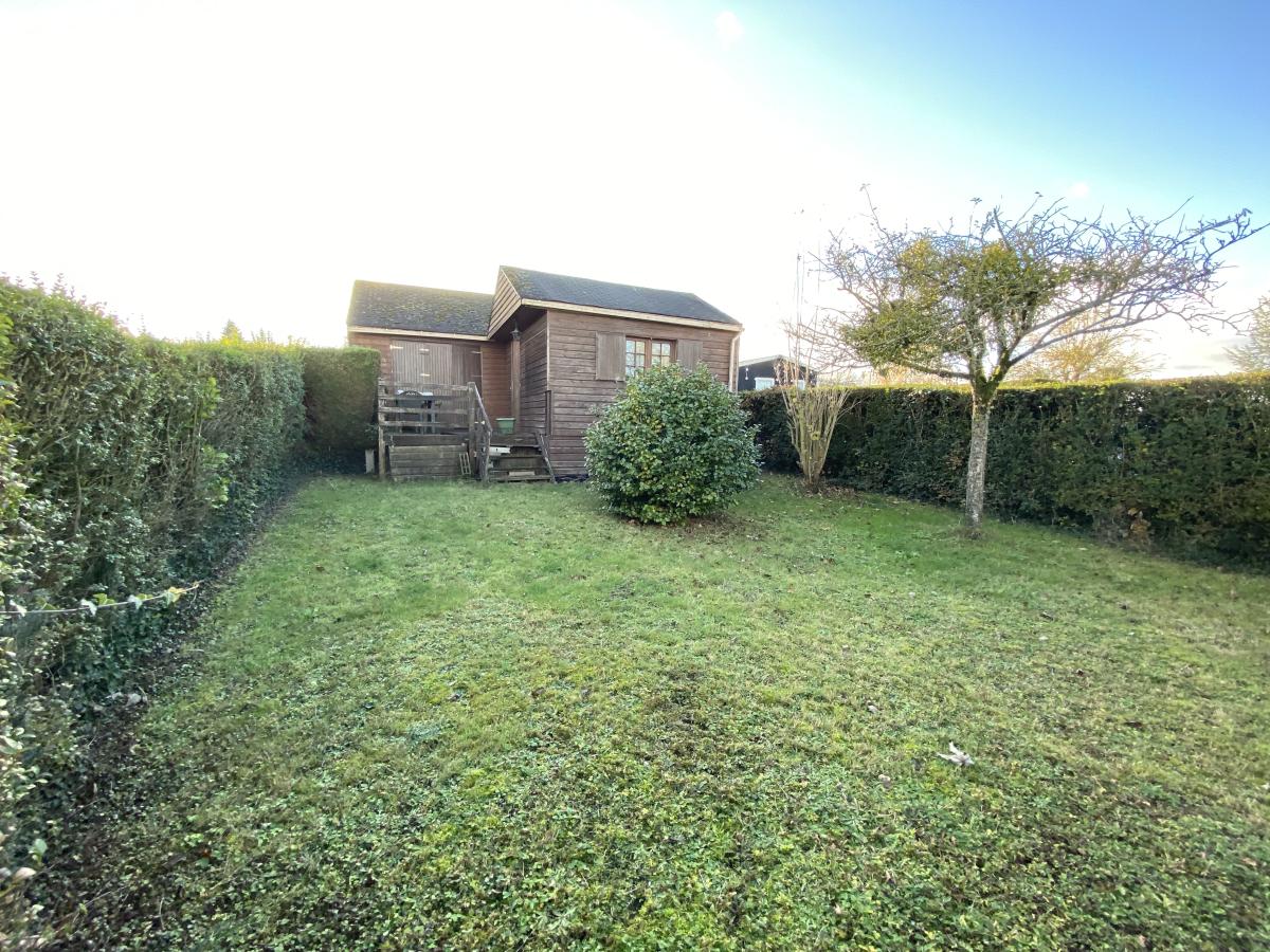 DOZULE, dans un parc résidentiel, chalet de 65m² comprenant, entrée, cuisine, salon/séjour, deux chambres, salle de bains avec wc. Terrasse et jardin 326m². Place de parking.