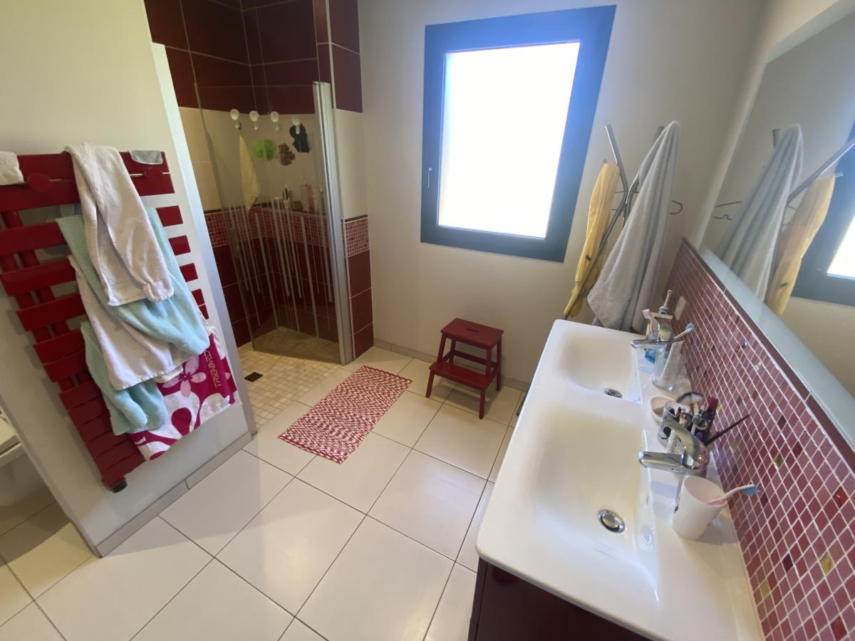 Maison contemporaine de 154m² au calme comprenant, entrée, salon/séjour, cuisine aménagée et équipée ouverte sur le séjour, un bureau avec placards, 3 chambres dont deux avec dressing, salle d'eau avec WC, arrière cuisine, WC. A l'étage, combles à finir d'emménager (possibilité de faire deux chambres et une salle de bains). Belle terrasse plein sud, quart port pour deux voitures, abri de jardin. Terrain de 1125m².