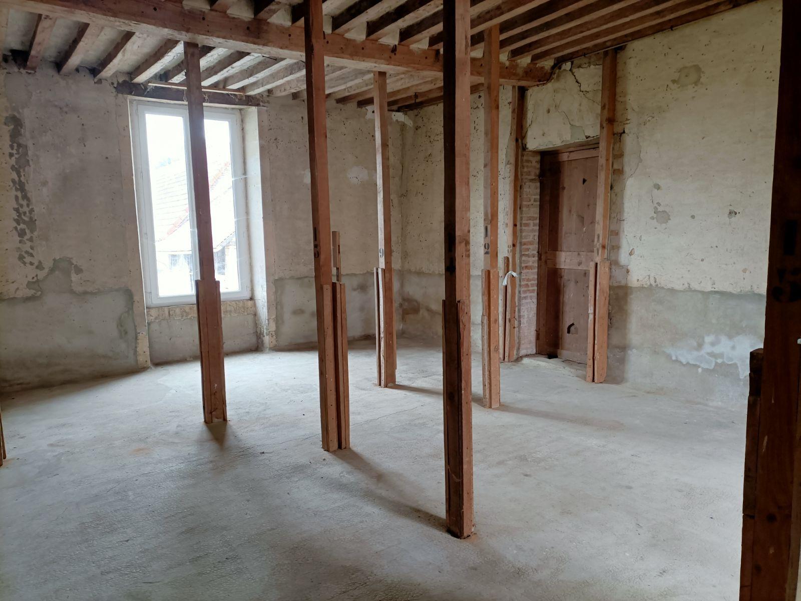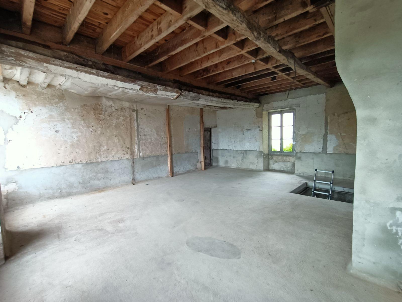 Elle se divise en deux espaces : une partie rénovée comprenant deux pièces et un wc et une partie qui reste à restaurer d'environ 165m² sur trois niveaux.
