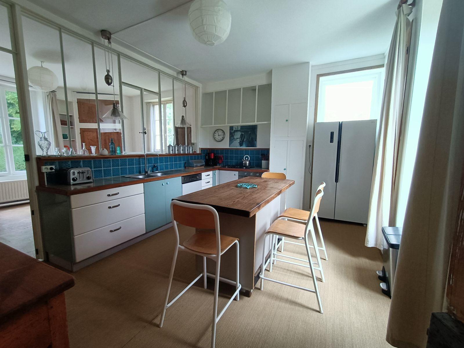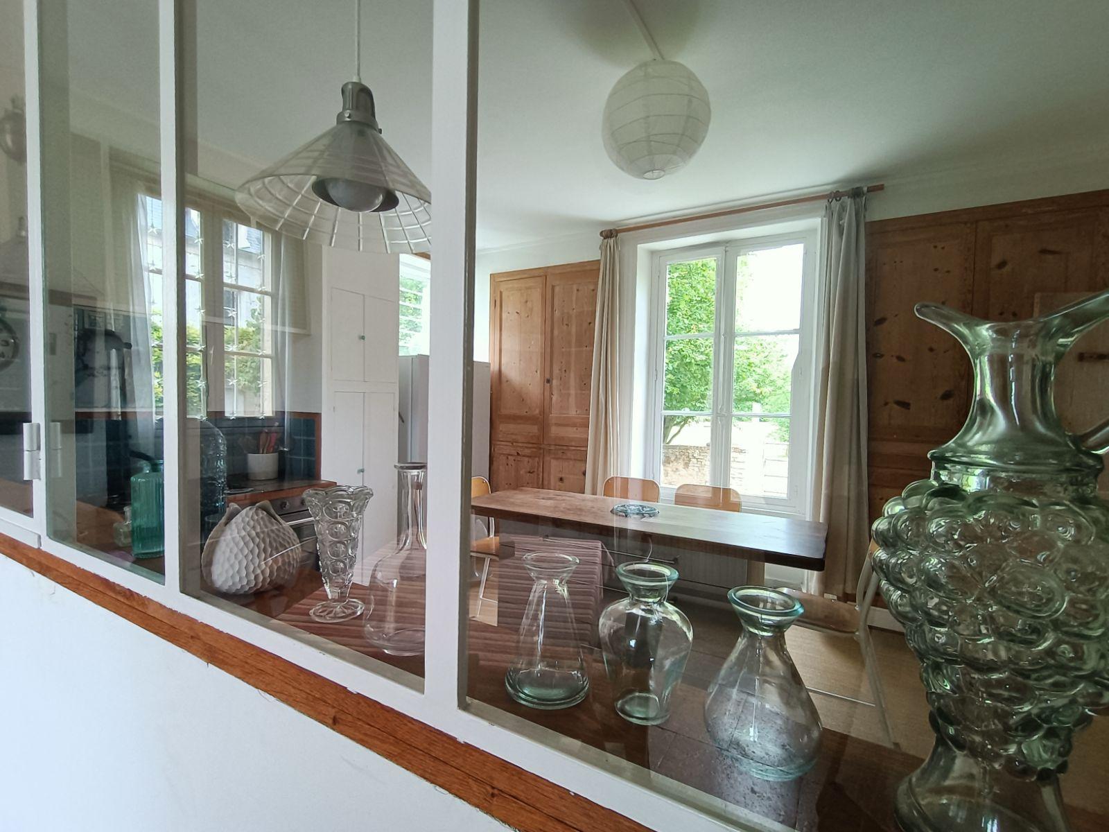 A gauche, la cuisine mélange subtil d'ancien et de confort moderne, et le coin repas avec son véritable puits, séparé par une majestueuse verrière.