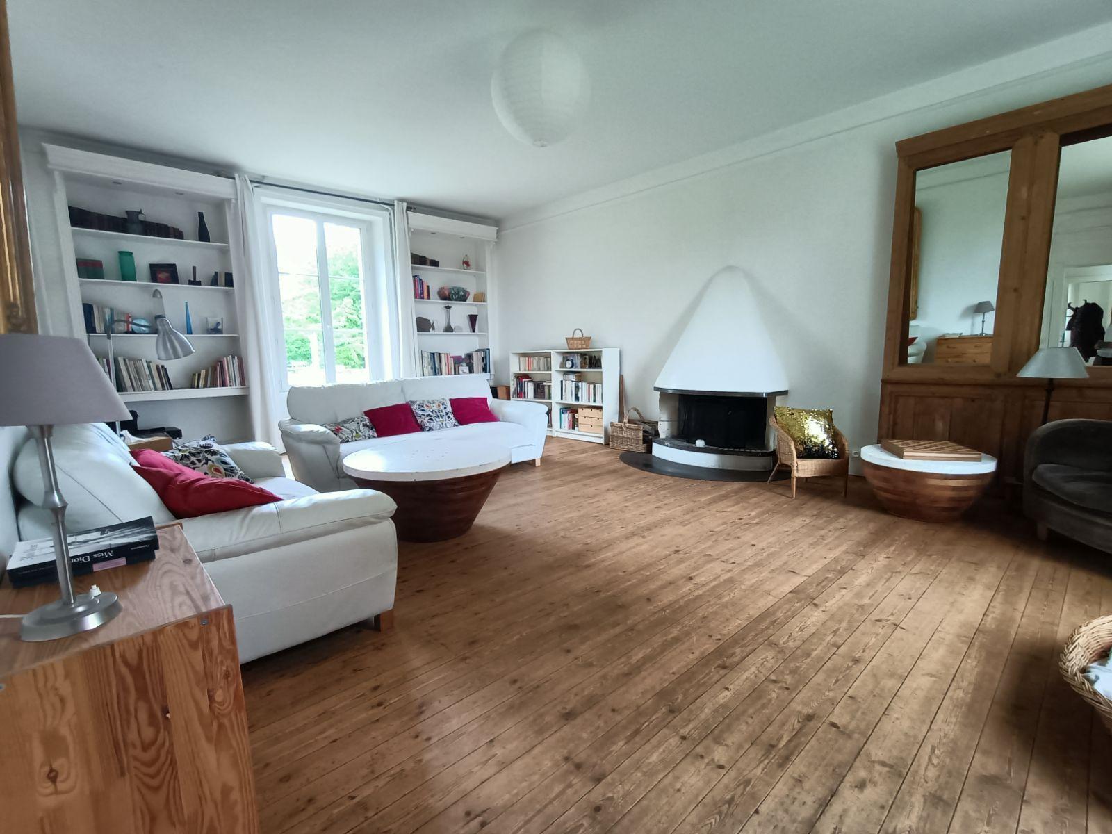 A droite, le spacieux salon avec sa cheminée et son parquet d'origine vous invite à la détente dans une ambiance chaleureuse.