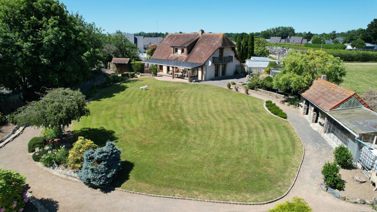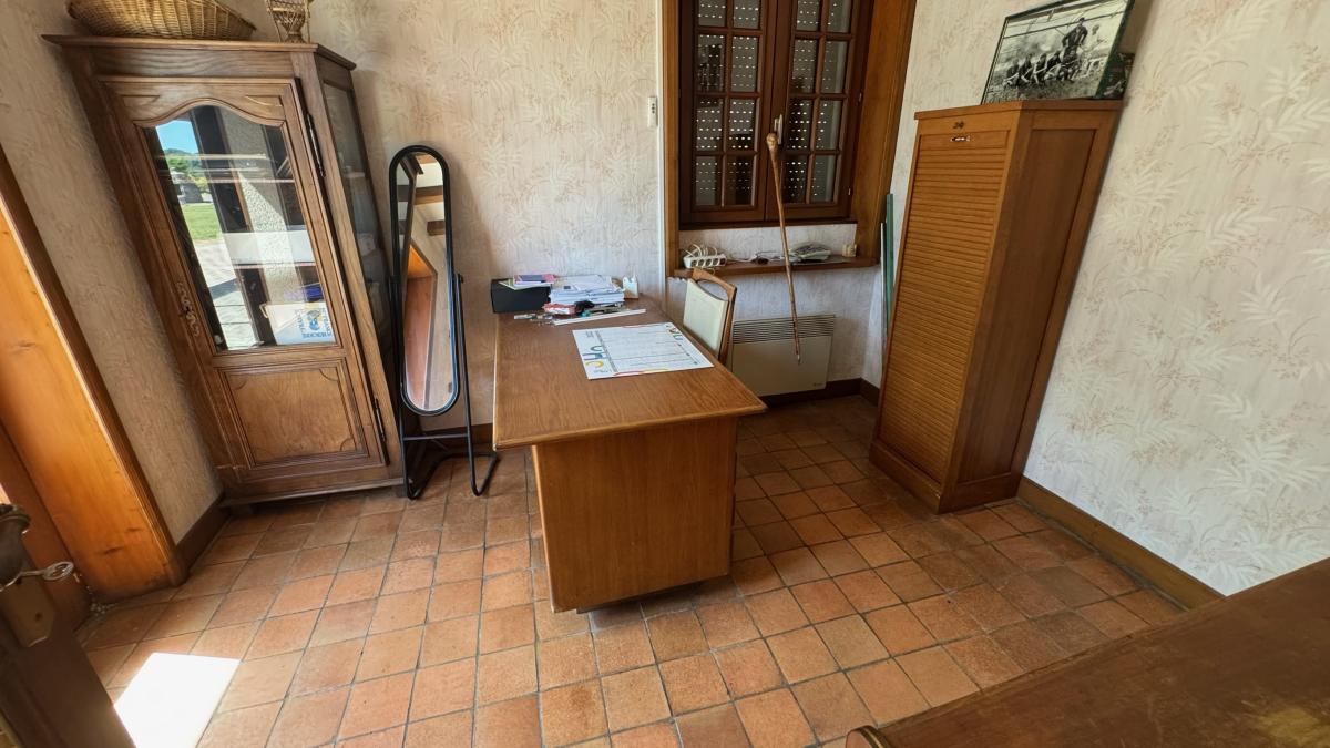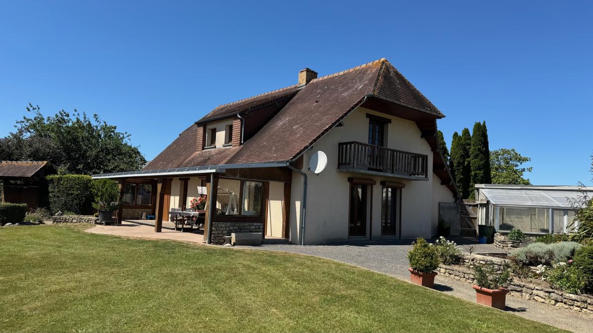 - Au rez-de-chaussée : entrée, cuisine aménagée de 15.75m², séjour/salon de 34m² avec poêle à bois, chambre de 11.2m² avec salle de douche privative, bureau de 8.6m², WC, arrière-cuisine avec accès buanderie, cave et garage, terrasse couverte.