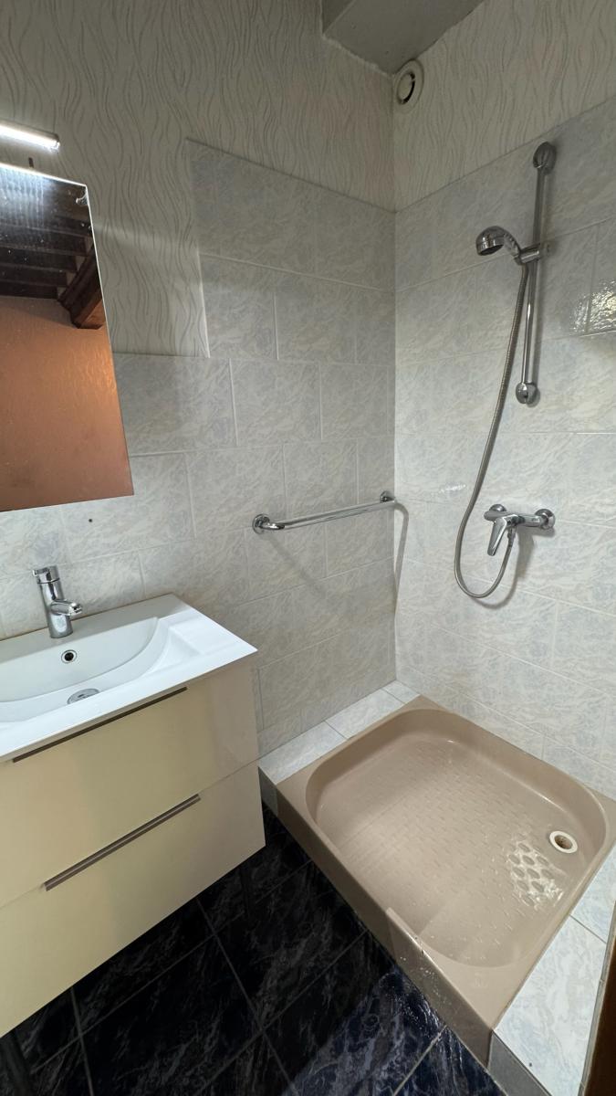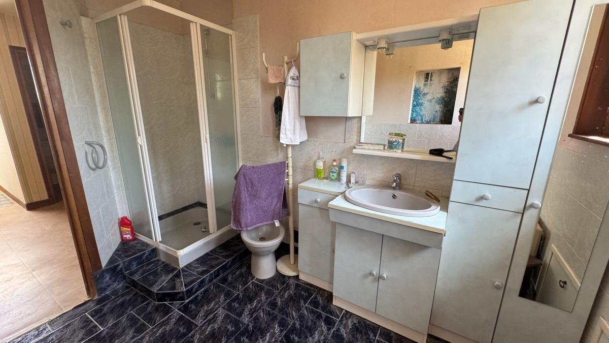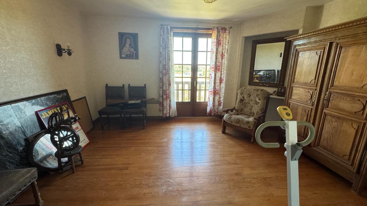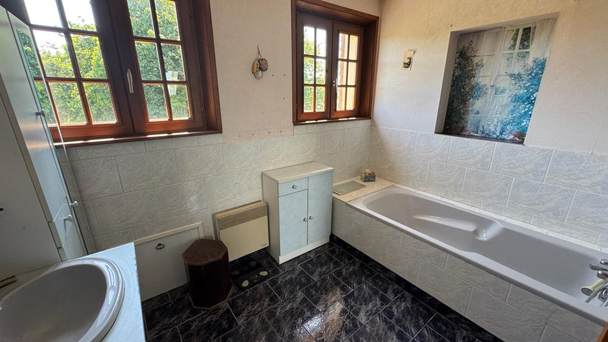 - A l’étage : palier avec placard, trois chambres (17.4m², 10m² et 19.5m²) dont deux avec balcon, salle de bains avec douche, binet et meuble vasque, WC.