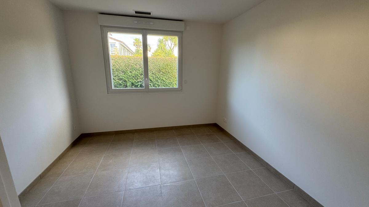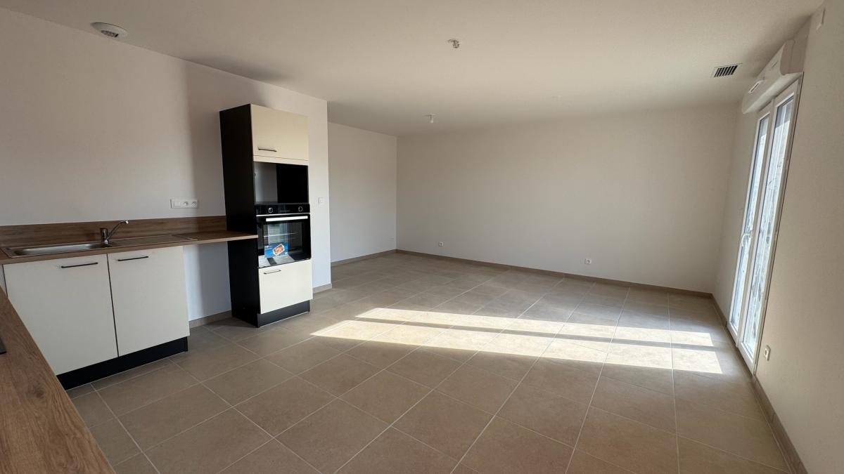Entrée dans pièce à vivre avec cuisine aménagée et équipée (plaque induction, four, hotte) ouverte sur séjour/salon de 30.7m², cellier, dégagement, deux chambres (12.61m² et 12.14m²), salle de douche et WC.