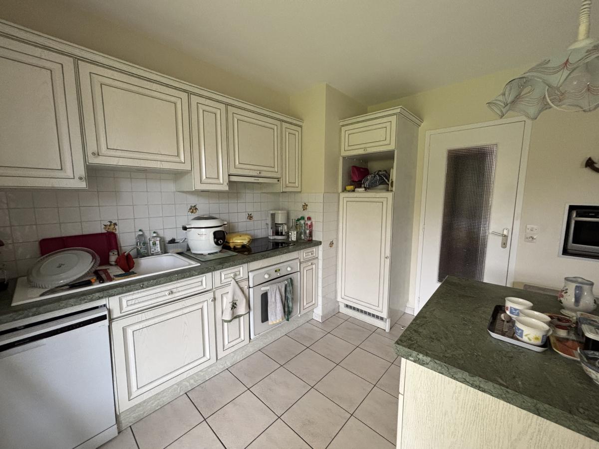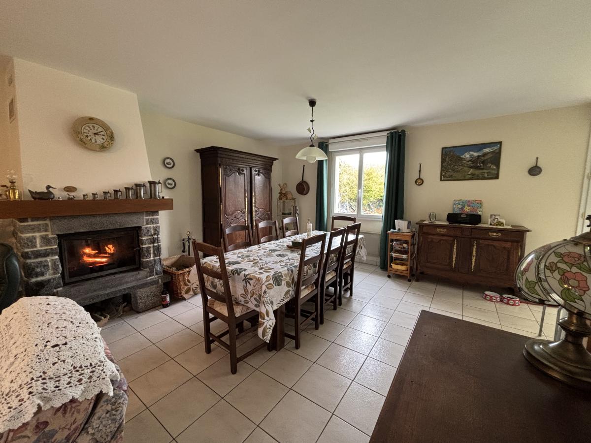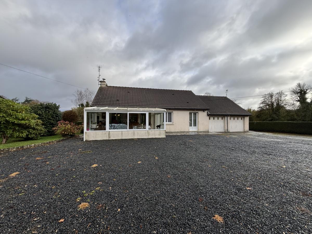 Entrée dans véranda de 24.66m², entrée avec dégagement, séjour/salon de 30.05m² avec insert, cuisine de 8.09m² ouverte aménagée et équipée (four, plaque, hotte, frigo) et îlot central, dégagement avec placard, salle de douche avec évier, trois chambres (11.63m², 11.55m² et 8.09m²), WC, deux garages attenants.