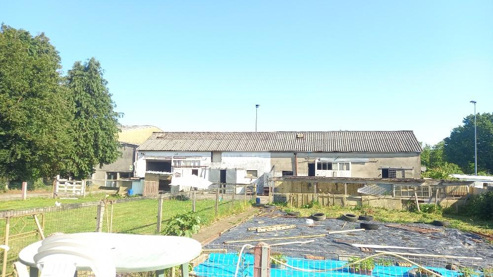 Cour derrière, ancienne écurie et atelier, poulailler, jardin, terrasse et pelouse devant.