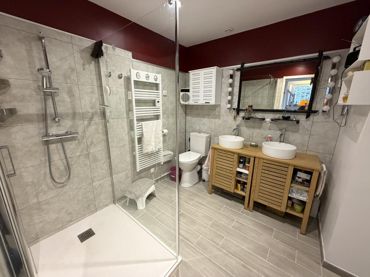 - Au rez de chaussée: séjour avec cheminée, placards et poêle à granulés, cuisine équipée, salle d'eau avec WC et douche à l'italienne, une grande chambre.