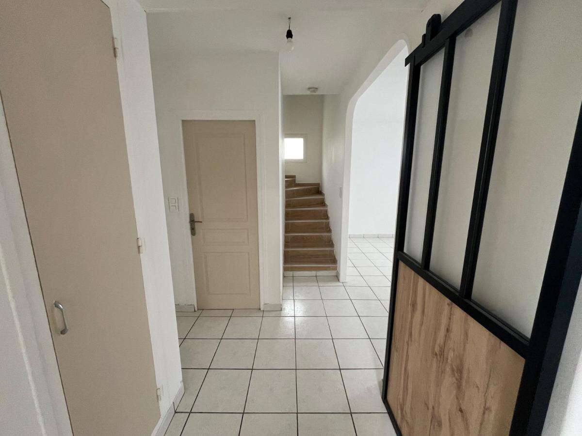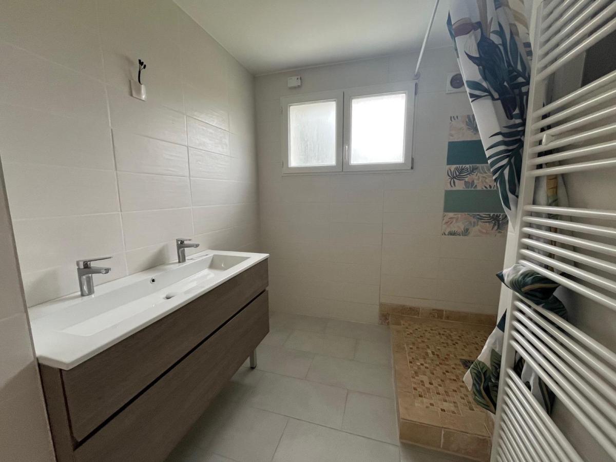 Rez de chaussée surélevé : Entrée, cuisine équipée (éléments hauts et bas, plaque de cuisson, hotte, four, réfrigérateur, lave-vaisselle) 10 m², coin repas 12 m², séjour avec insert 26 m², une chambre 11 m², wc, salle de douches,