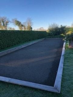 Cour goudronnée, portail électrique, terrain de pétanque.