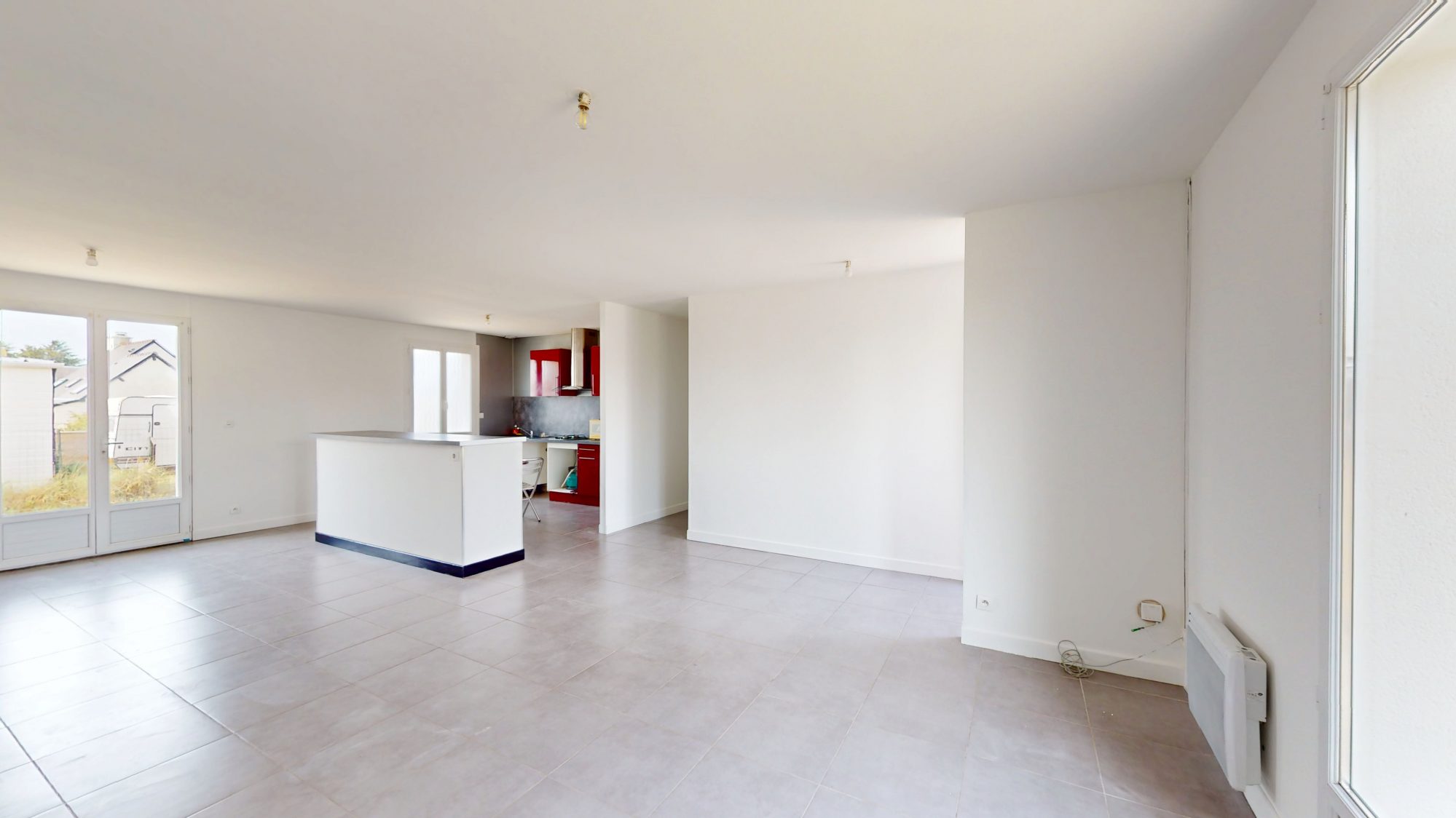 Pièce de vie avec cuisine ouverte, couloir desservant 4 chambres, WC indépendant et salle d'eau.