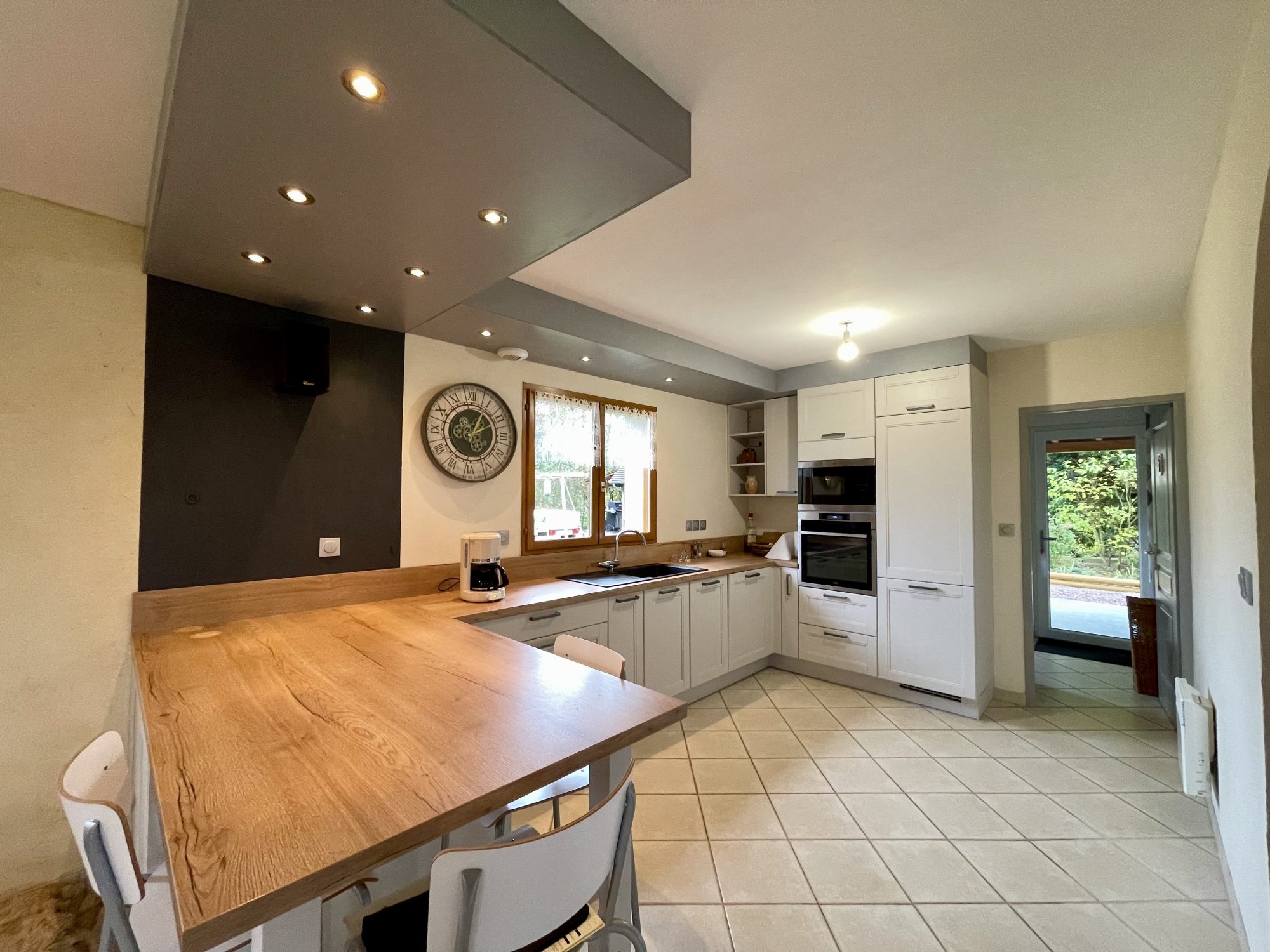-Au rez-de-chaussée une belle entrée desservant un séjour avec poêle à bois ouvert sur cuisine aménagée et équipée , une chambre , wc , et une arrière cuisine donnant sur une charreterie.